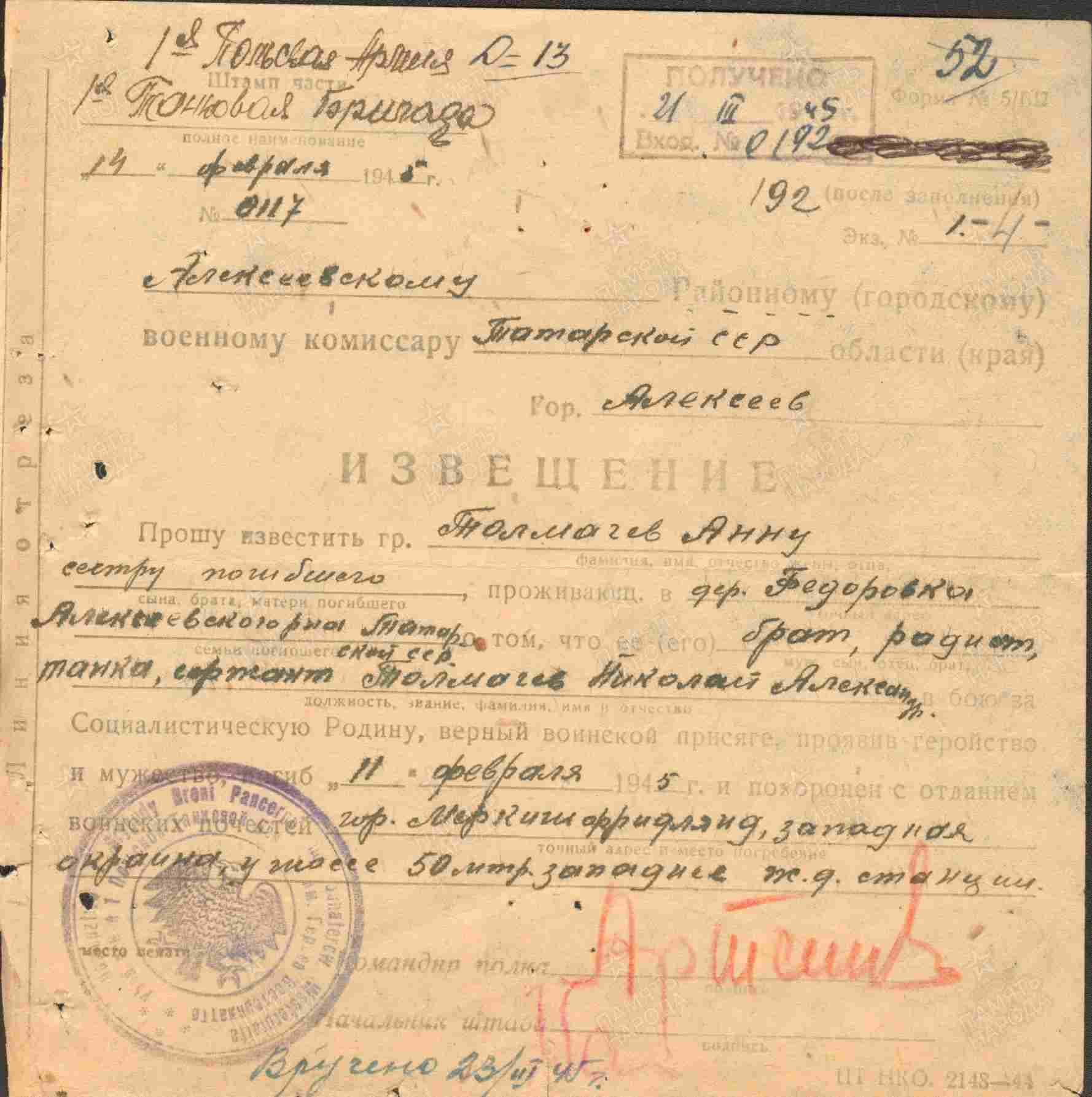 ТОЛМАЧЁВ Николай Александрович, 1925, д. Фёдоровка. Жил в с. Алексеевское. Мобилизован Алексеевским РВК 14 янв. 1943. Сержант, радиотелеграфист танка 1 отд. польской ТБр 1 А Войска Польского 1 Белорусского фронта. Погиб 11 фев. 1945, г. Меркиш Фридлянд (Мирославец), Валецкий повят, Западно-Поморское воеводство, Польша.
