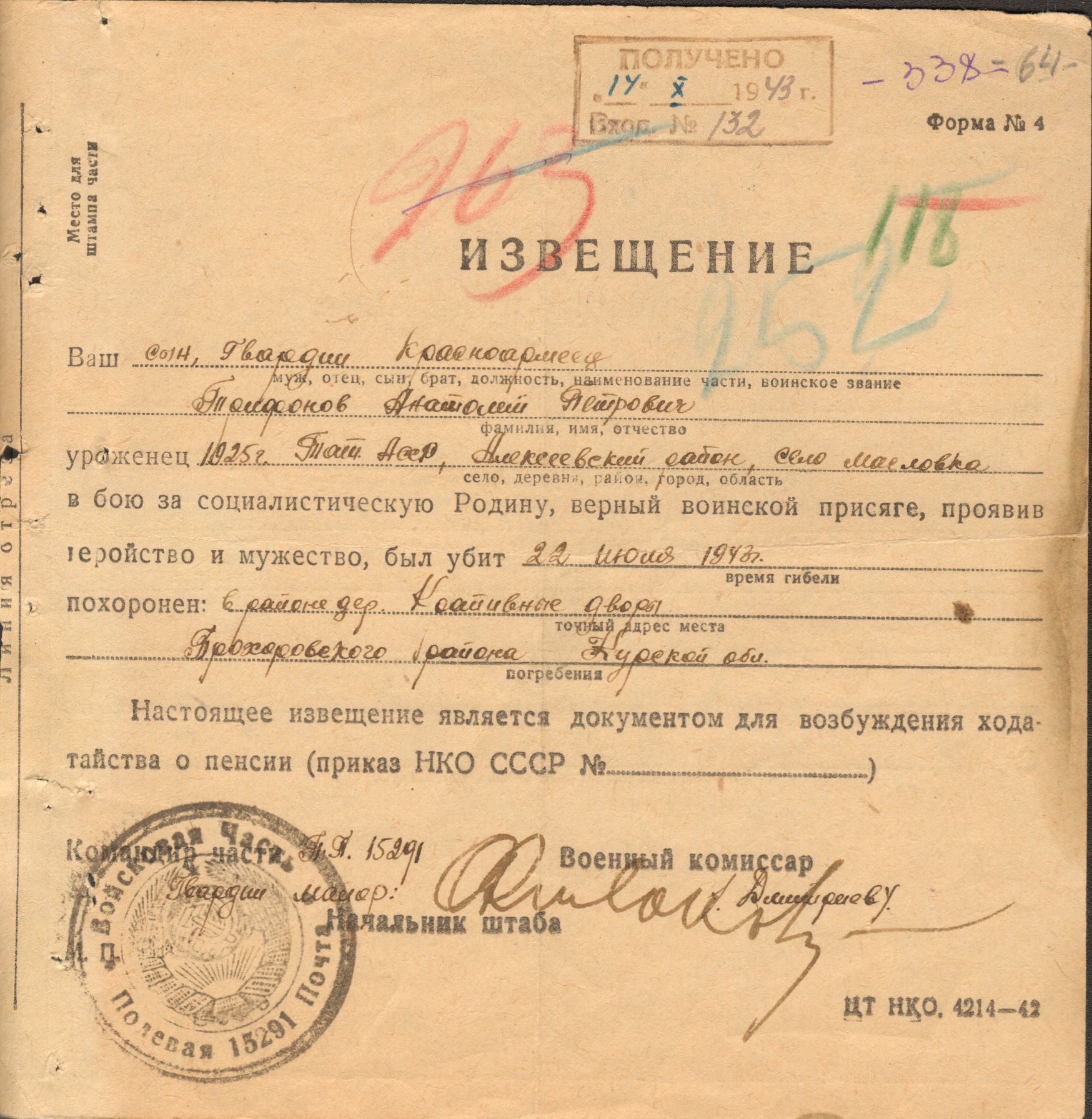 ТРИФОНОВ Анатолий Петрович, (1925, с. Масловка). Мобилизован Алексеевским РВК. Гв. красноармеец, 127 гв. СП, 42 гв. СД. Погиб 22.07.1943 у д. Лучки Прохоровского (Беленихинского) р-на Курской обл. По другим данным – д. Крапивные Дворы Яковлевского района Белгородской обл.