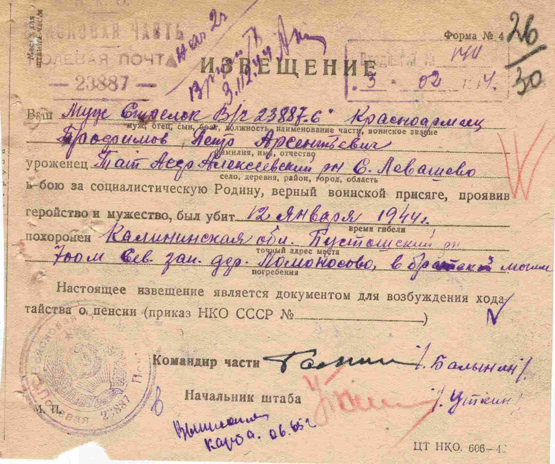 ТРОФИМОВ Пётр Арсентьевич, 1910, с. Левашёво. Мобилизован в 1941 Дзержинским РВК г. Казань. Красноармеец, 127 отд. СБр, 469 СП 150 СД 34 А Северо-Западного фронта/ 6 гв. А 2 Прибалтийского фронта. Убит 12 янв. 1944, с. Ломоносово, Пустошкинский р-н, Псковская обл. Увековечен на братском захоронении в д. Сергейцево.
