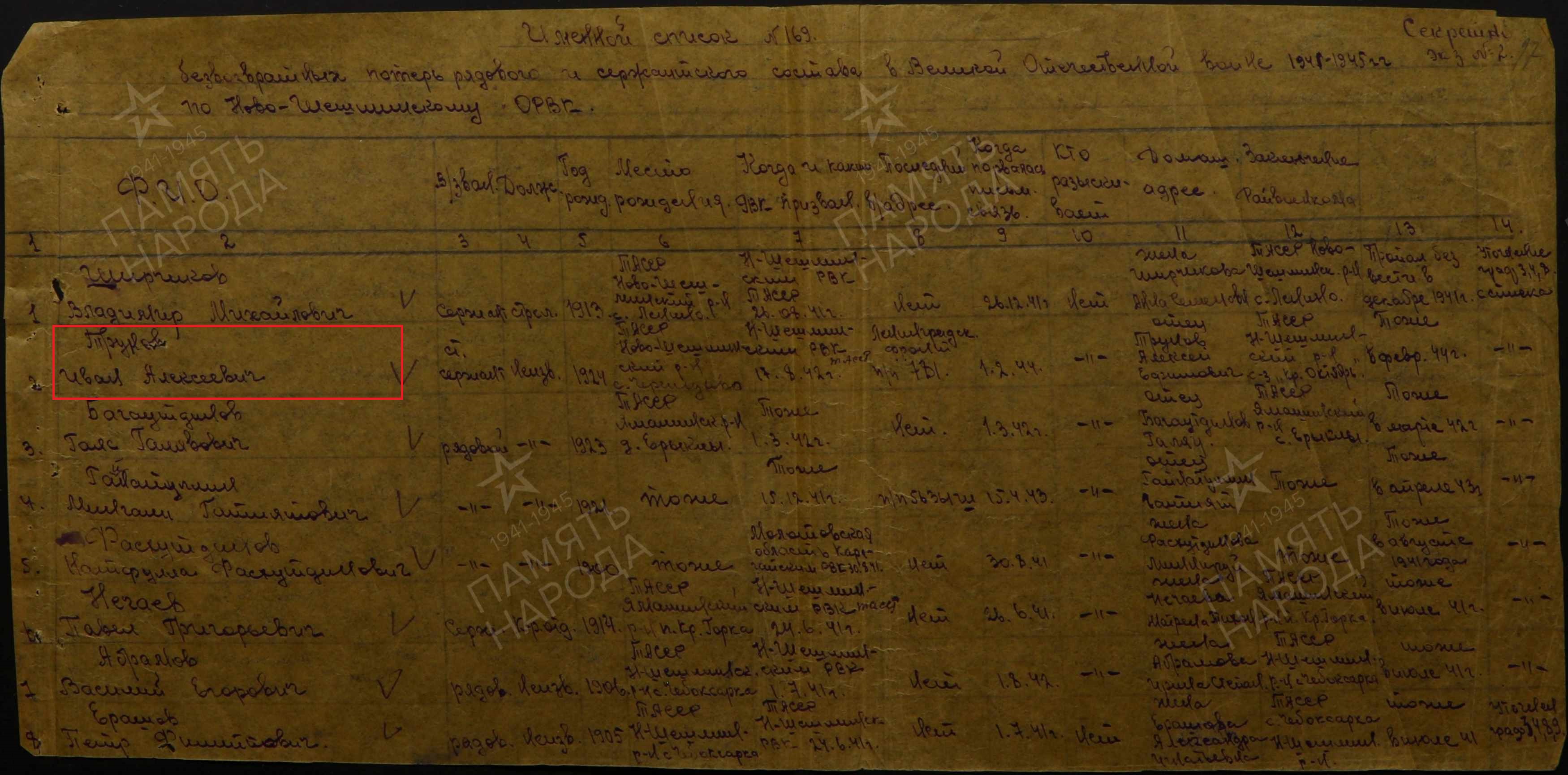 ТРУНОВ ИВАН АЛЕКСЕЕВИЧ родился в 1924 году в с.Слобода Черемуховая Чистопольского кантона ТАССР. (ныне с.Слобода Черемуховая Новошешминского района РТ). Мобилизован Новошешминским РВК,ст.с-т,74 гв.сд. Пропал без вести 05.44.г. Область выбытия: Днепропетровская обл..