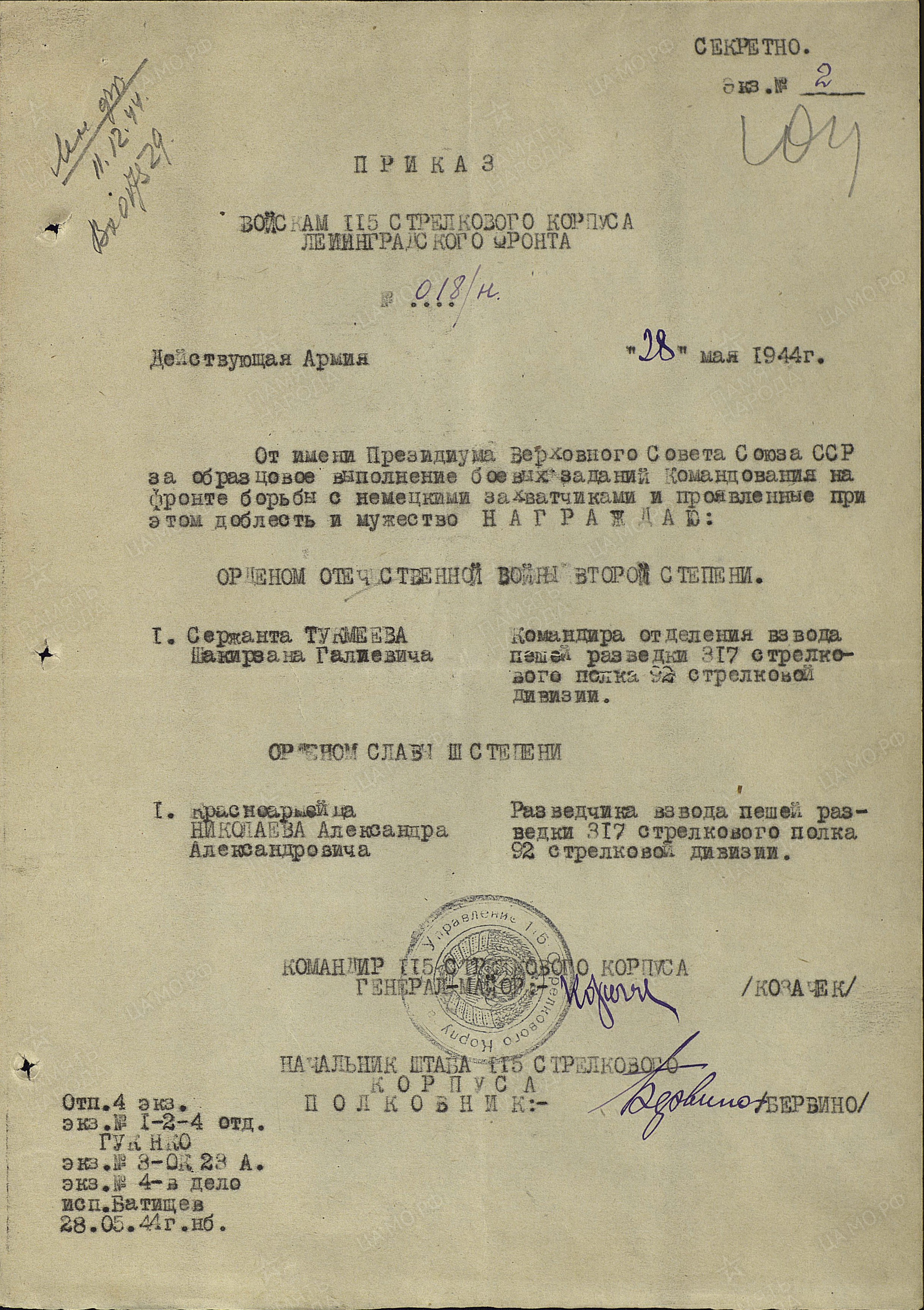 28 мая 1944 г. за участие в группе захвата был представлен к правительственной награде ордену «Отечественной войны 2-й степени»