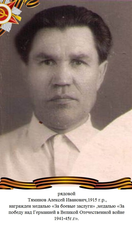 Тяминов Алексей Иванович родился в 1915 году в селе Сихтерма Спасского уезда Казанской губернии (ныне Алькеевского района РТ). Фронтовик. Участник Великой Отечественной войны. Призван Алькеевским РВК ТАССР. Награжден медалями «За боевые заслуги», «За Победу над Германией в Великой Отечественной войне 1941-1945гг».