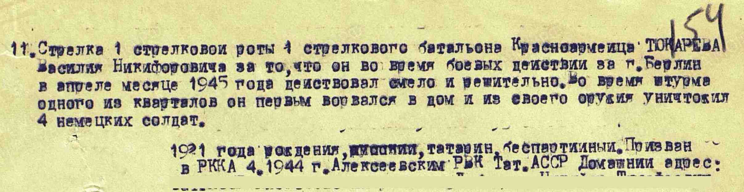 ТЮКАРЁВ Василий Никифорович, 1921, с. Лебедино. Призван 10 апр. 1941 Алексеевским РВК. Красноармеец, стрелок. В 1941 попал в плен. Освобождён в 1944. После прохождения спецпроверки направлен на пополнение 512 СП 146 СД 3 УдА 2 Прибалтийского/ 1 Белорусского фронта. Участник освобождения Польши и штурма Берлина. Награждён медалью «За отвагу», «За взятие Берлина».