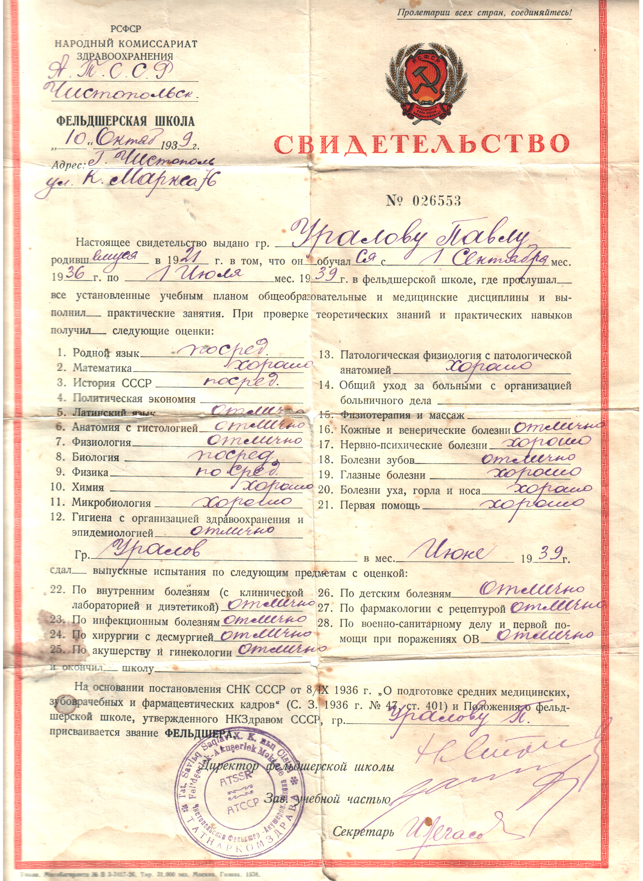 В 1936 году он, ещё мальчишкой, закончив 7 классов, из родной деревни Верхняя Уратьма Шереметьевского района пешком пришёл в Чистополь, чтобы осуществить свою мечту – стать медиком. Через три года он с отличием закончил Чистопольскую фельдшеро-акушерскую школу. И 17 -летний талантливый парень стал заведующим Верхнеуратьминским врачебным пунктом.