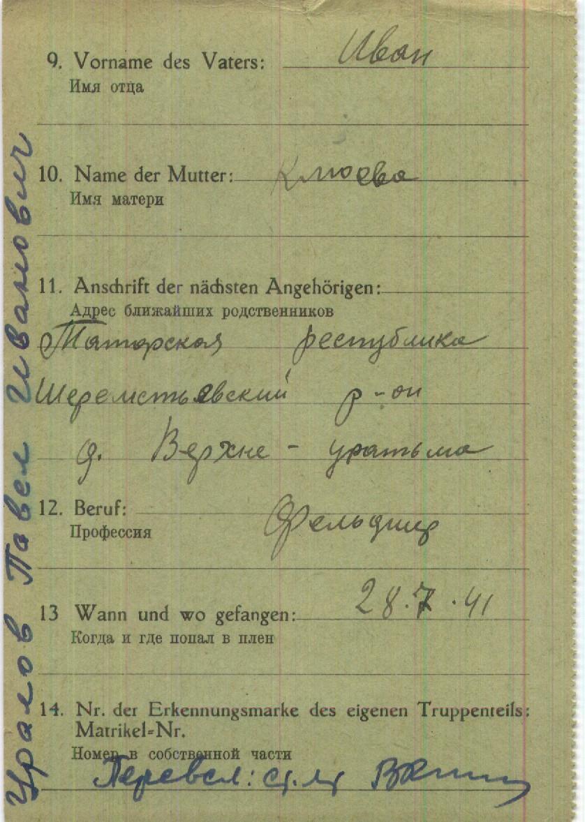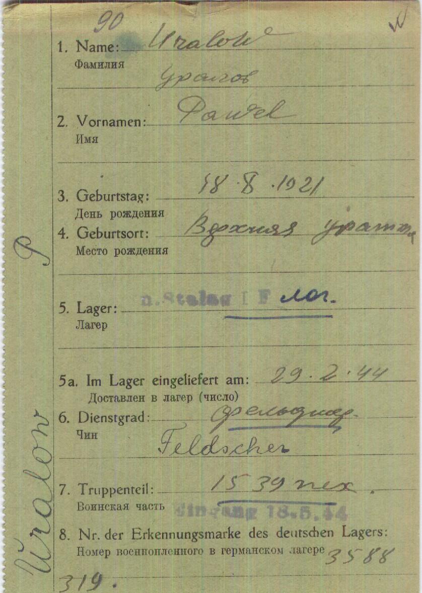 Три лагеря прошёл во вражеском плену Павел Иванович. Сохранившаяся так называемая Зелёная карточка учёта военнопленных, которая была оформлена на лейтенанта Уралова, говорит о том, что 29 февраля 1944 года он перемещён в шталаг I F Эбенроде или Прёкульс. А оттуда 26 сентября того же года – в шталаг 312 (ХХ С) Торн. Эти лагеря находились на территории оккупированной Польши.