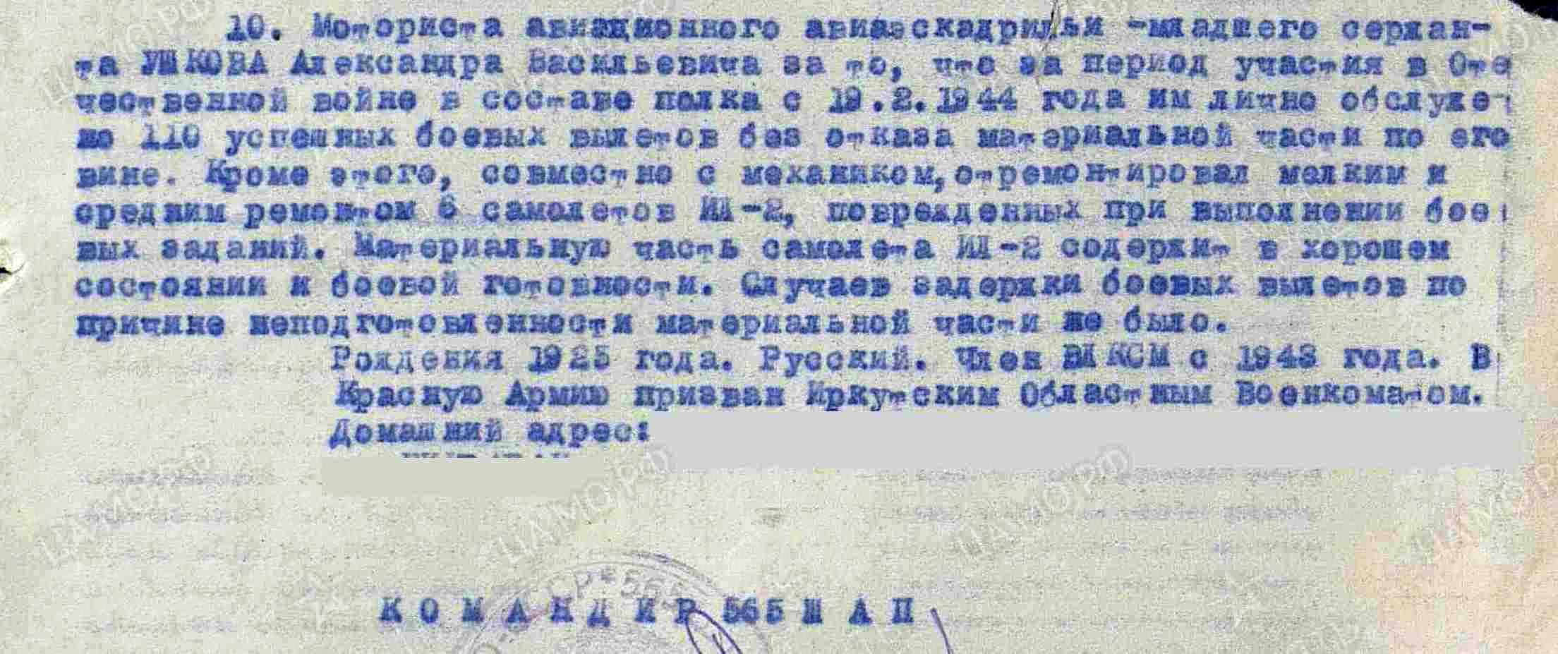 УШКОВ Александр Васильевич, 1925, д. Николаевский Баран. Член ВЛКСМ. Мобилизован Иркутским ОВК в янв. 1943. В боевой части с 19 фев. 1944. Мл. сержант, авиамоторист 565 ШАП 224 ШАД в составе 2 ВА 1 Украинского фронта/ 8 ШАК 8 ВА 4 Украинского фронта. Участник освобождения Украины и Чехословакии. Обслужил 110 успешных боевых вылетов, совместно с механиком отремонтировал мелким и средним ремонтом шесть самолётов Ил-2, повреждённых на боевых заданиях. Награждён медалями «За боевые заслуги». «За освобождение Варшавы», орденом Отечественной войны 2 ст. (1985).