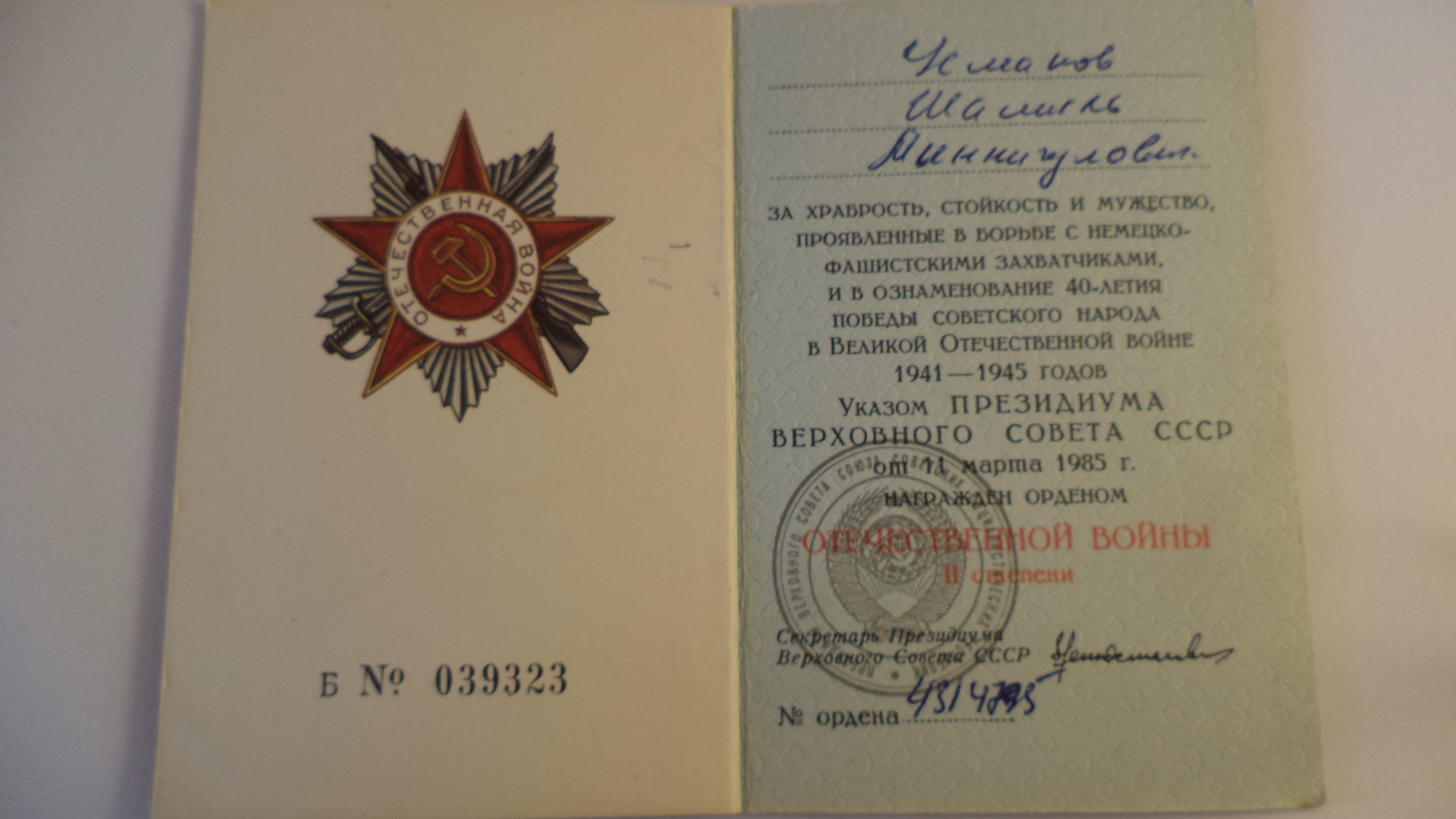 Когда началась война, 1941 году вернулся в родную деревню, начал работать на колхозе. 19 декабря 1942 года отправили на войну из Азнакаевского военкомата. 6 месяцев был в учебном полке и получил звание сержанта. Отправили их на Волховский фронт. Освободили от немецких захватчиков много сел и городов. 2 февраля 1944 года получил ранение и попал в госпиталь. После лечения отправили на Дальний Восток. Демобилизовался 2 июня 1947 года.