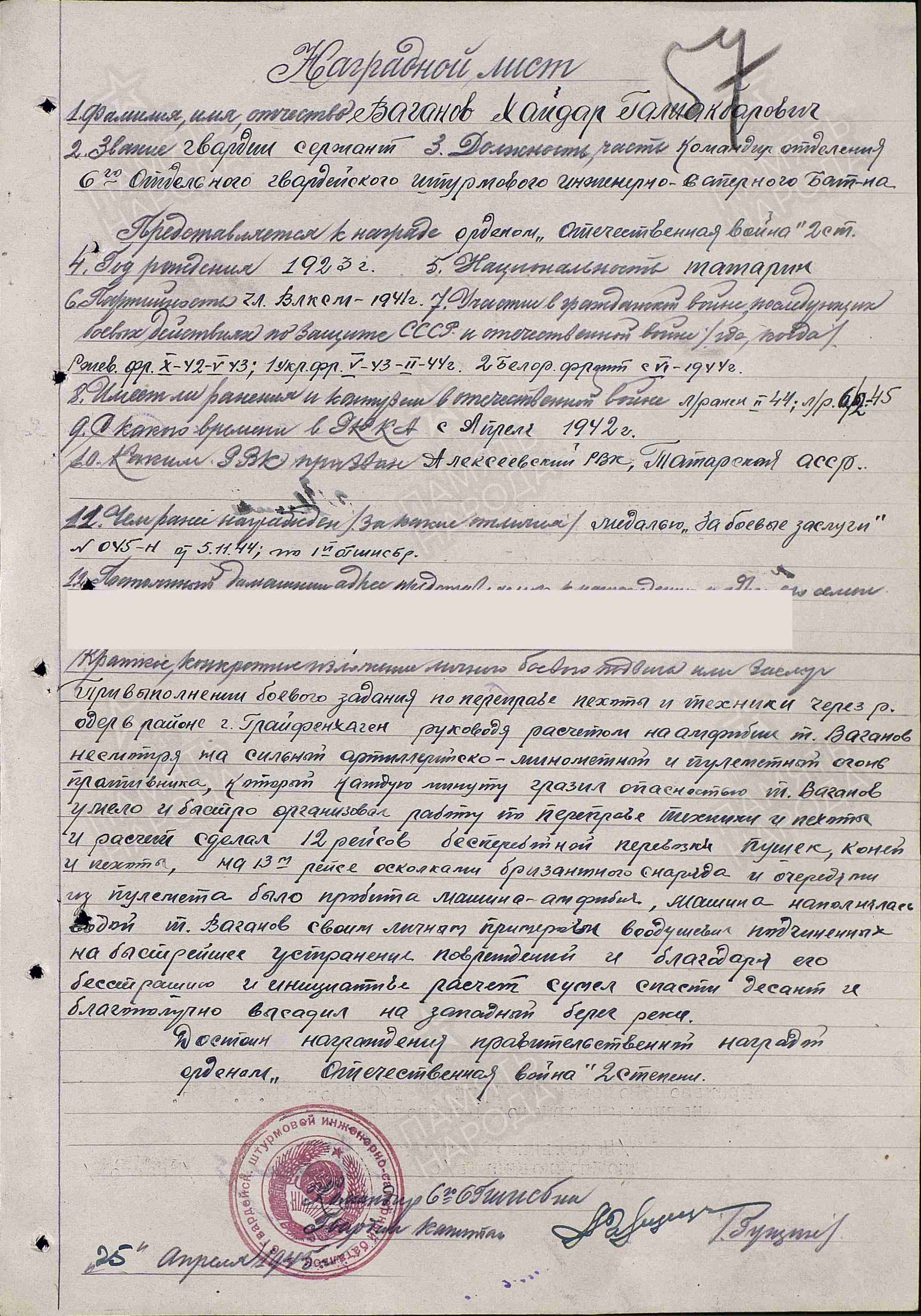 ВАГАПОВ Хайдар Галиакбарович, 1923, с. Средние Тиганы. Член ВЛКСМ. Мобилизован Алексеевским РВК в апр. 1942. Воевал на Калининском фронте с окт. 1942 по май 1943, Воронежском/ 1 Украинском фронте с мая 1943 по фев. 1944. Перенёс два лёгких ранения в фев. 1944 и фев. 1945. С июня 1944 воевал в составе 6 отд. штурмового инженерно-сапёрного батальона 1 гв. ШИСБр 50 А/ 48 А/ 2 УдА/ 70 А 2 Белорусского фронта, гв. сержант, ком. отделения. Награждён медалью «За боевые заслуги», орденами Красной Звезды, Отечественной войны 1 ст. (1985). После войны жил в г. Казань.