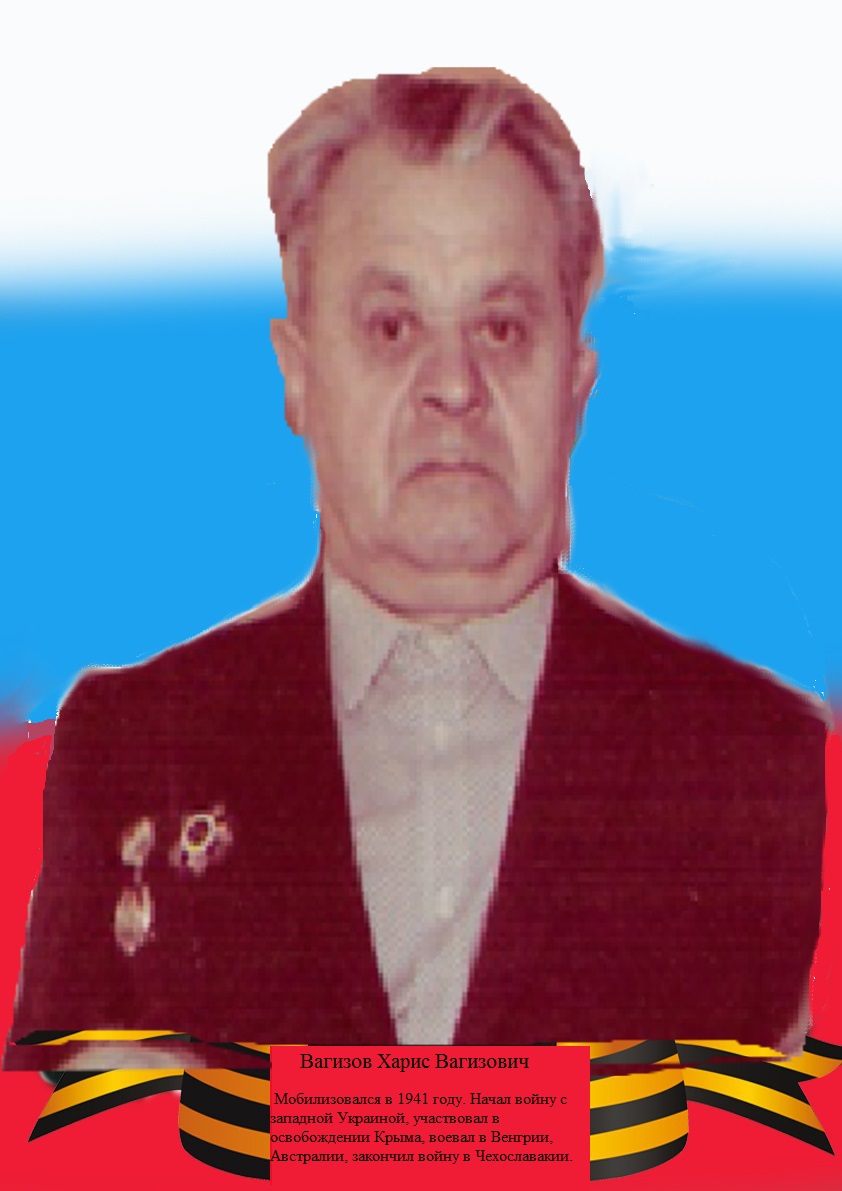 Родился в 1917 г. В 1941 г. Вагизов Харис Вагизович призван в ряды Красной Армии. Начал войну с Западной Украины, участвовал в освобождении Крыма, воевал в Венгрии, Австрии, закончил войну в Чехословакии.