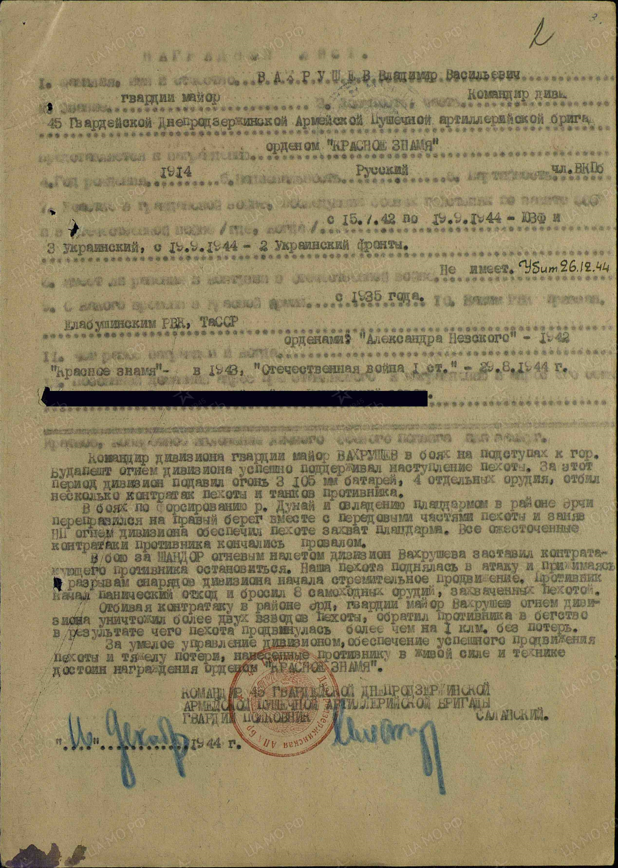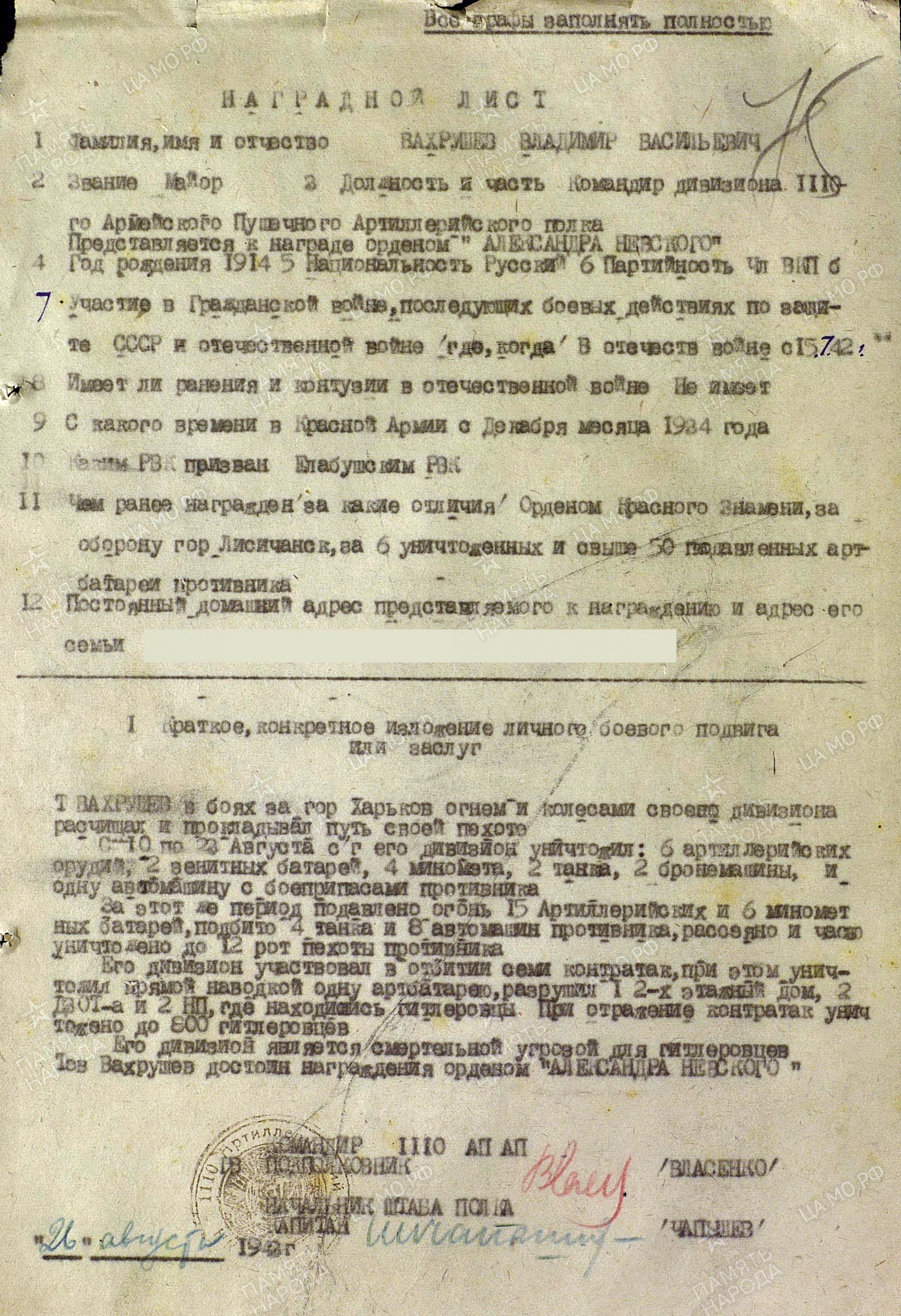 Из наградного листа: т.Вахрушев в боях за г.Харьков огнем и колесами своего дивизиона расчищал и прокладывал путь своей пехоте. С 10 по 23 августа его дивизион уничтожил 6 артиллерийских орудий, 2 зенитные батареи, 4 миномета, 2 танка, 2 бронемашины, одну автомашину с боеприпасами противника. За этот же период подавлен огонь 15 артиллерийских и 6 минометных батарей, подбито 4 танка и 8 автомашин противника, рассеяно и часть уничтожено до 12 рот противника. Его дивизион участвовал в отбитии семи контратак, при этом уничтожил прямой наводкой одну артбатарею, разрушил двухэтажный дом, два ДЗОТа и два НП, где находились гитлеровцы. При отражении контратак уничтожено до 800 гитлеровцев. Его дивизион является смертельной угрозой для гитлеровцев. Достоин награждения орденом Александра Невского».