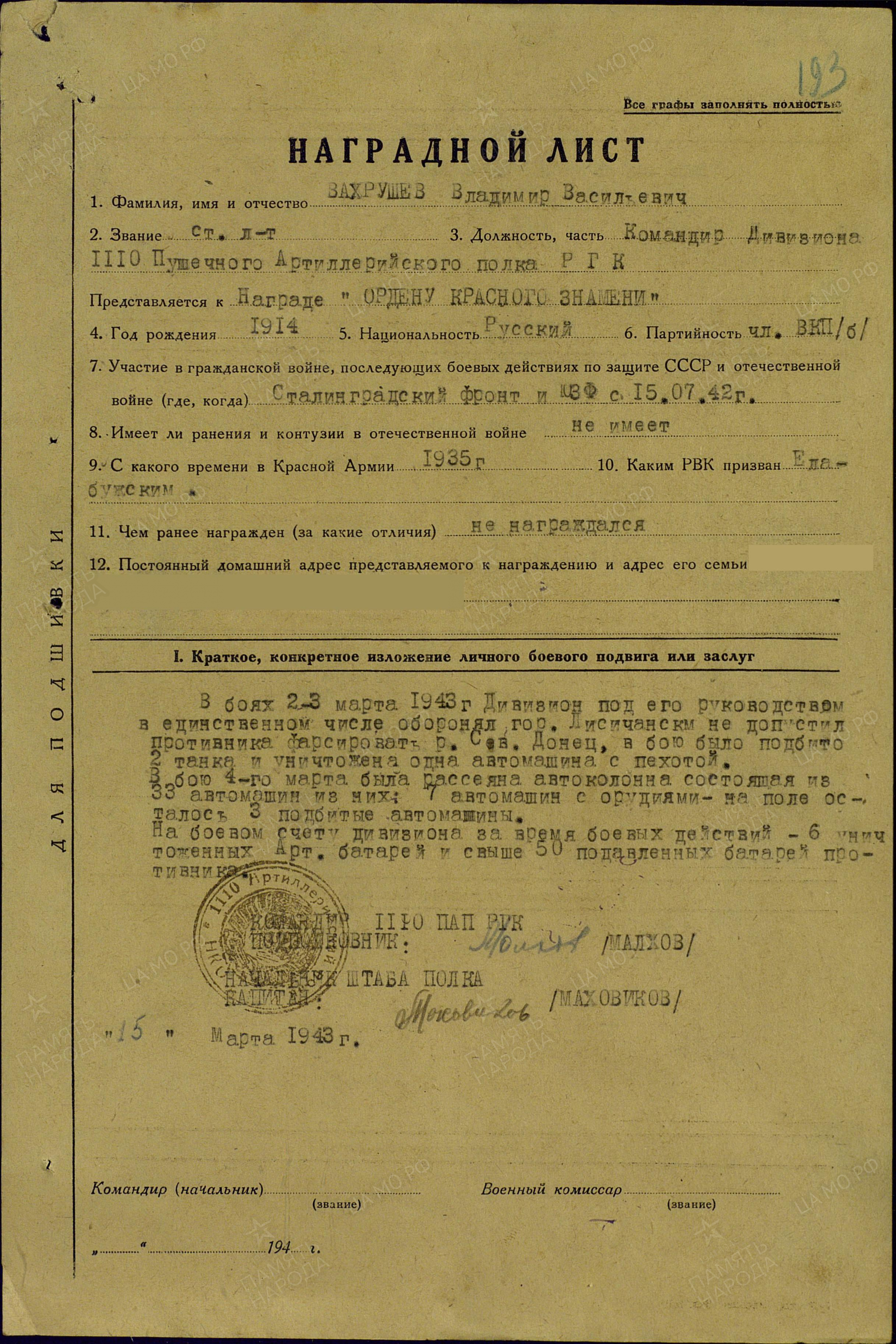 Мобилизован в 1935 г. Елабужским РВК, Татарская АССР, Елабужский район.