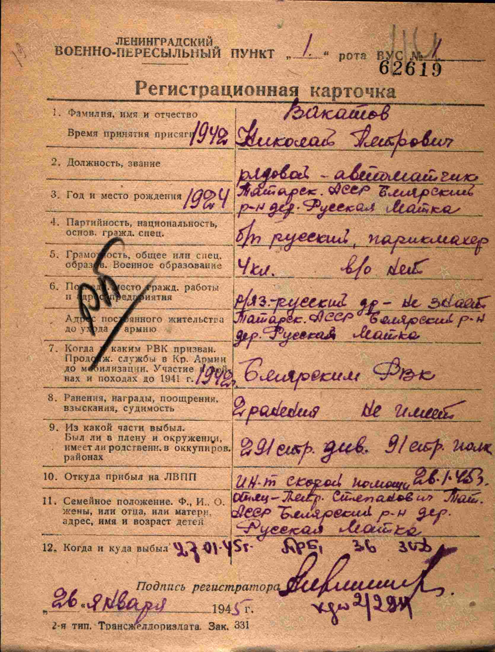 ВАКАТОВ Николай Петрович, 1924, д. Русская Майна. Мобилизован 24 авг. 1942 Билярским РВК. В действующей армии с апр. 1943. Красноармеец, стрелок-разведчик 379 СД 8 А Волховского фронта. Легко ранен в ногу 21 авг. 1943. После излечения воевал в составе 309 СП 291 СД 55 А/ 42 А/ 67 А Ленинградского фронта. Тяжело ранен 6 апр. 1944. Находился на излечении в разных госпиталях и Институте скорой помощи до янв. 1945. С 16 фев. 1945 воевал в составе 742 СП 164 СД 6 гв. А 1 Прибалтийского фронта, 10 гв. А 2 Прибалтийского фронта, 4 УдА Курляндской группы войск Ленинградского фронта. Награждён медалью «За отвагу», орденом Отечественной войны 2 ст. (1985). Демобилизован 28 фев. 1947. В послевоенное время работал на кондитерской фабрике в г. Чистополь.