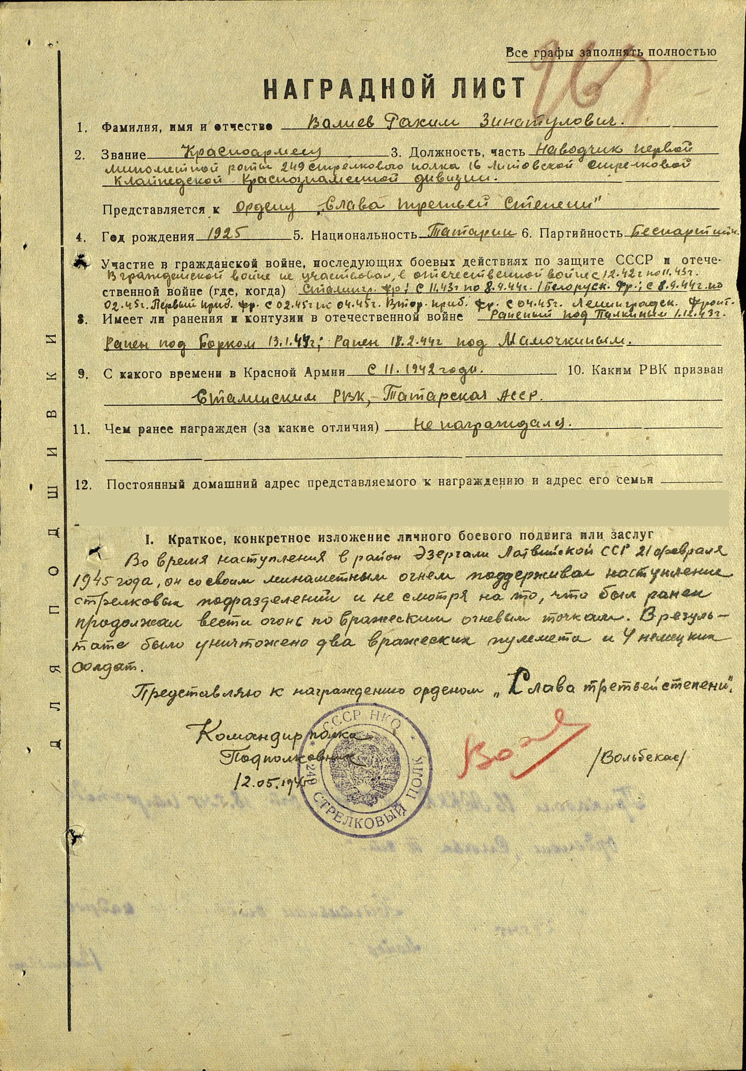 ВАЛЕЕВ Рахимзян Зиннатович, 1925, с. Средние Тиганы. Мобилизован в 1942 г. (!) Сталинским РВК г. Казани. Красноармеец (ефрейтор), миномётчик (до февраля 1945 г.), повар взвода снабжения 249 СП 16 СД. Трижды ранен. Воевал на Сталинградском, 1 Бел., 1 Приб., 2 Приб., Лен. фронтах. Награждён орденом Славы 3 ст., медалью "За боевые заслуги", орденом Отечественной войны 1 ст. (1985 г.). Демобил. в 1947 г. Работал плотником-строителем в к-зе "Алга". Умер в 1990 г. Похоронен в с. Средние Тиганы.