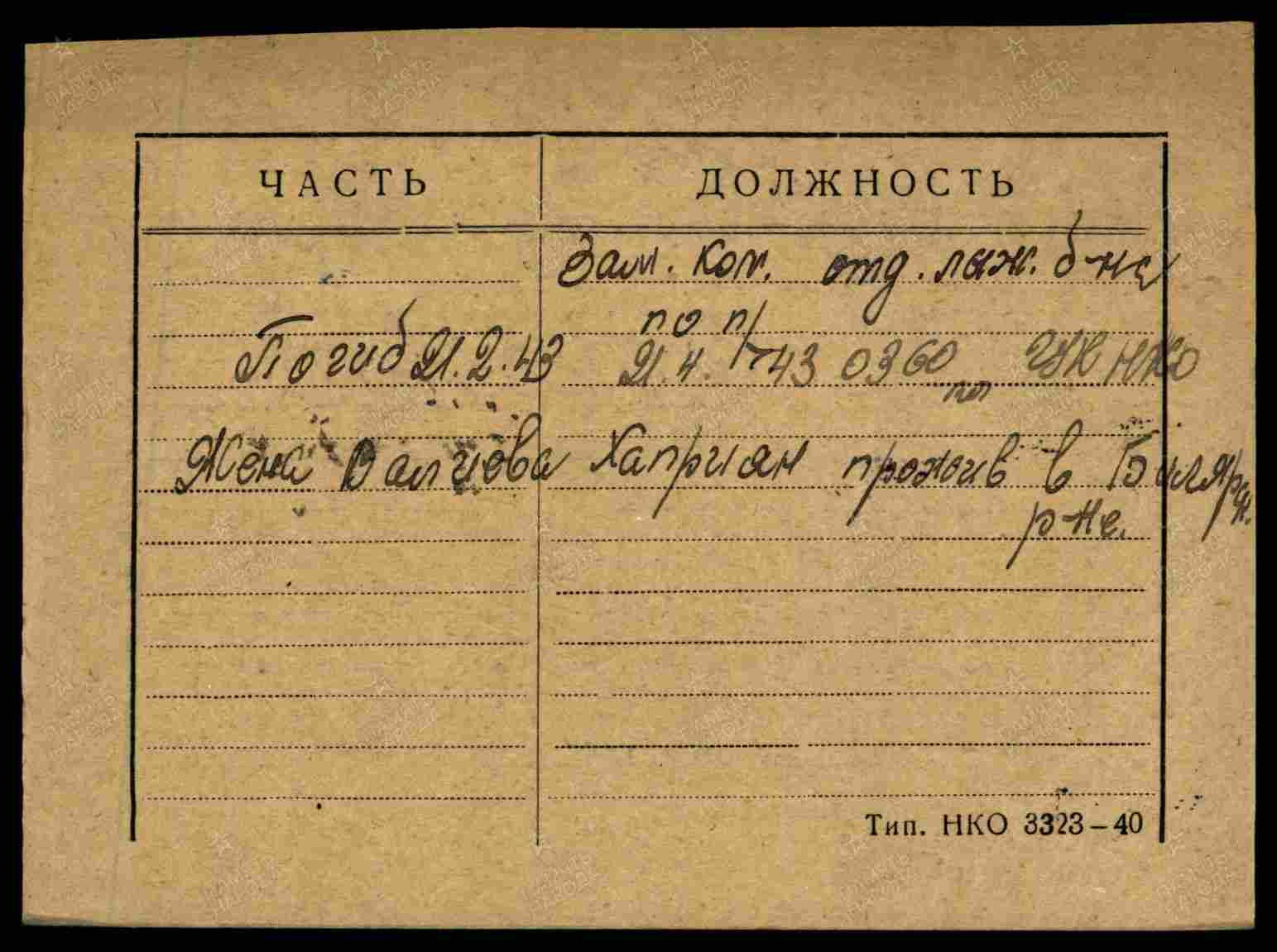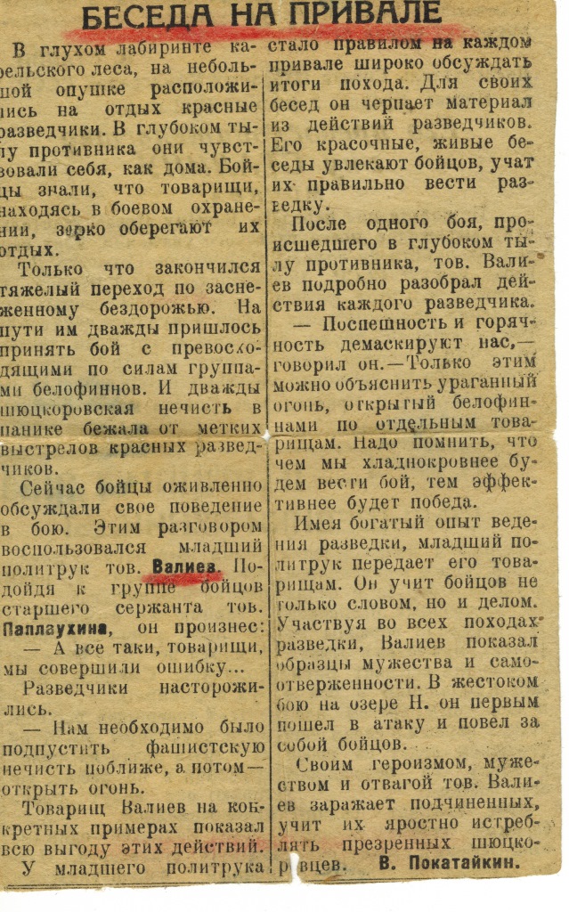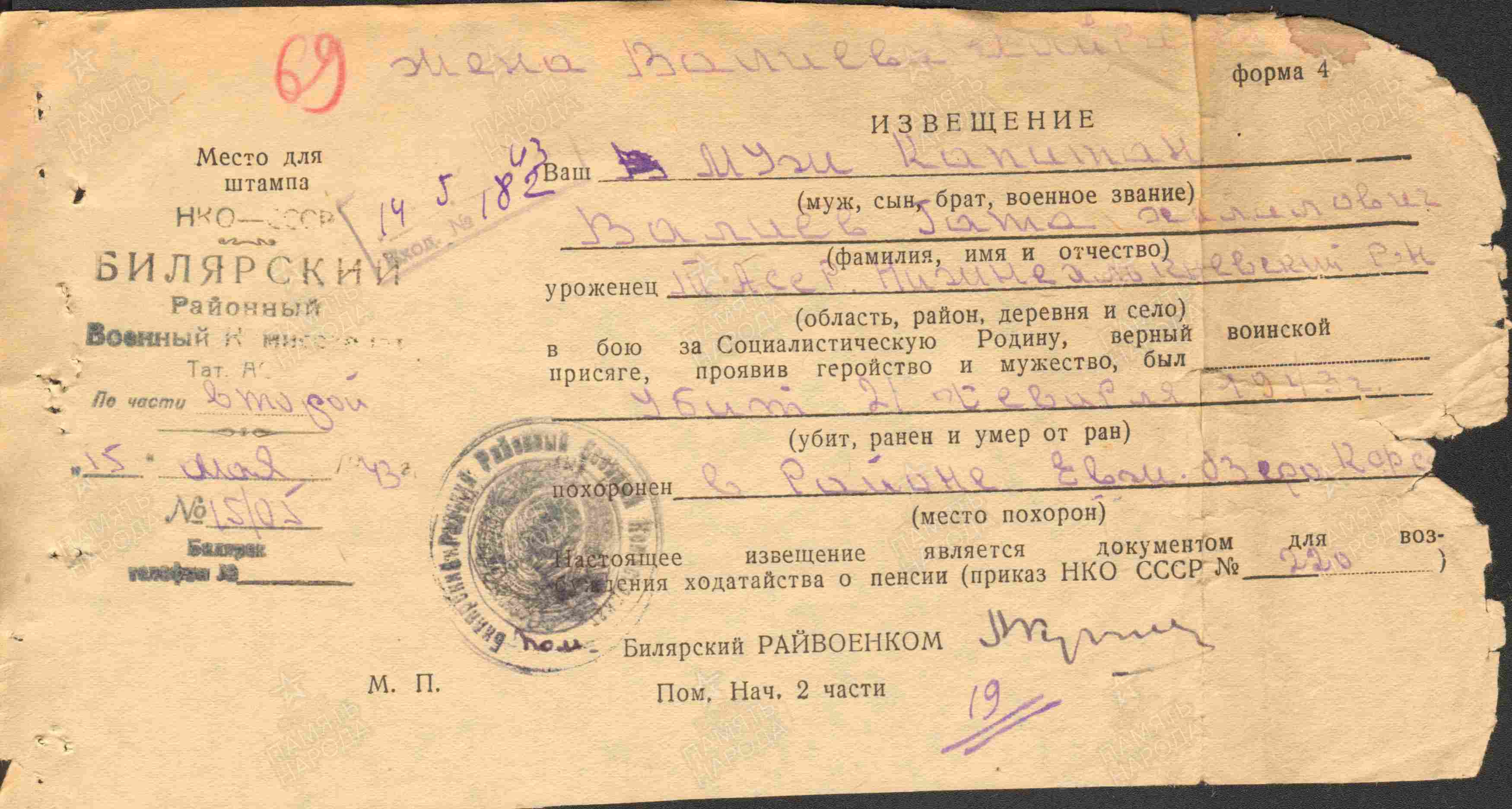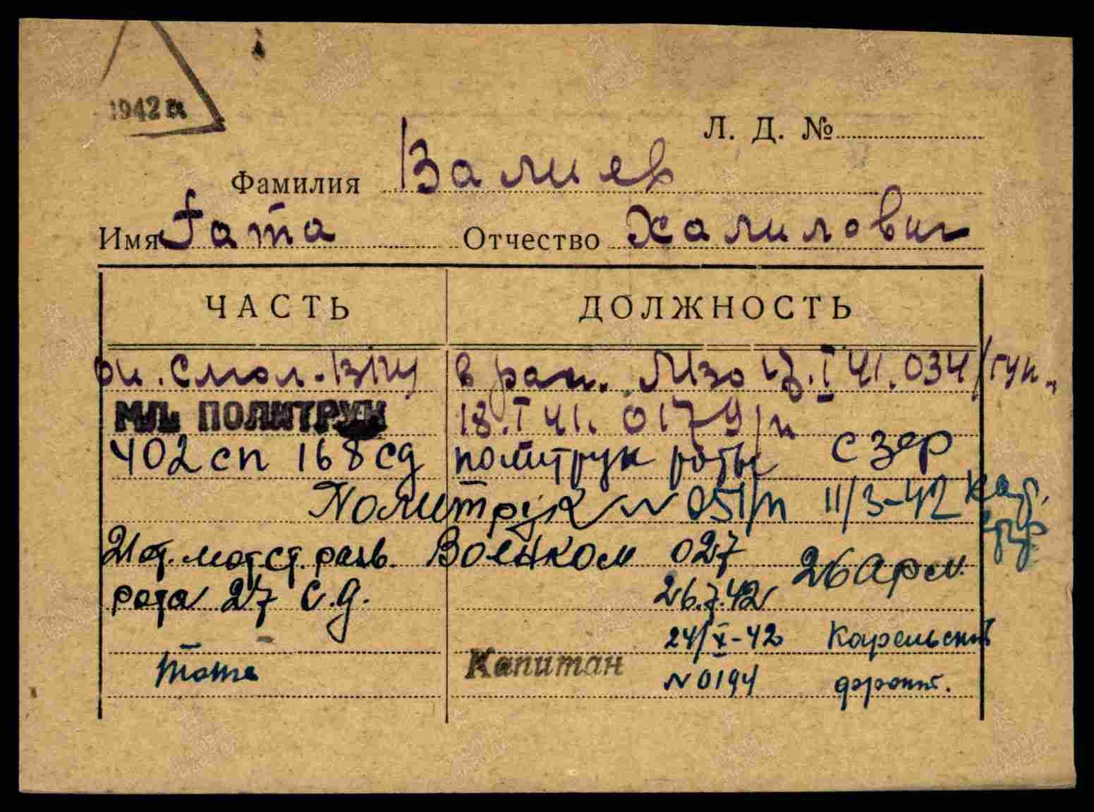 ВАЛИЕВ Гата Халилович, 1916, с. Старое Алпарово, жил в д. Кызыл Уракча. Призван Билярским РВК в 1937. Окончил Смоленское ВПУ. Член ВКП(б). Мл. политрук, политрук роты 402 СП 168 СД 7 А/ 23 А Северного фронта; политрук роты 239 СП/ 337 СП, военком 21 отд. развед. роты, капитан, зам. ком. отд. лыжного батальона 27 СД 26 А Карельского фронта. Погиб и оставлен на территории противника 21 фев. 1943, кв. 2029-а, Евж. Озеро, Муезерский р-н, Карело-финская ССР. Увековечен в п. Ругозеро, Муезерский р-н, Республика Карелия.