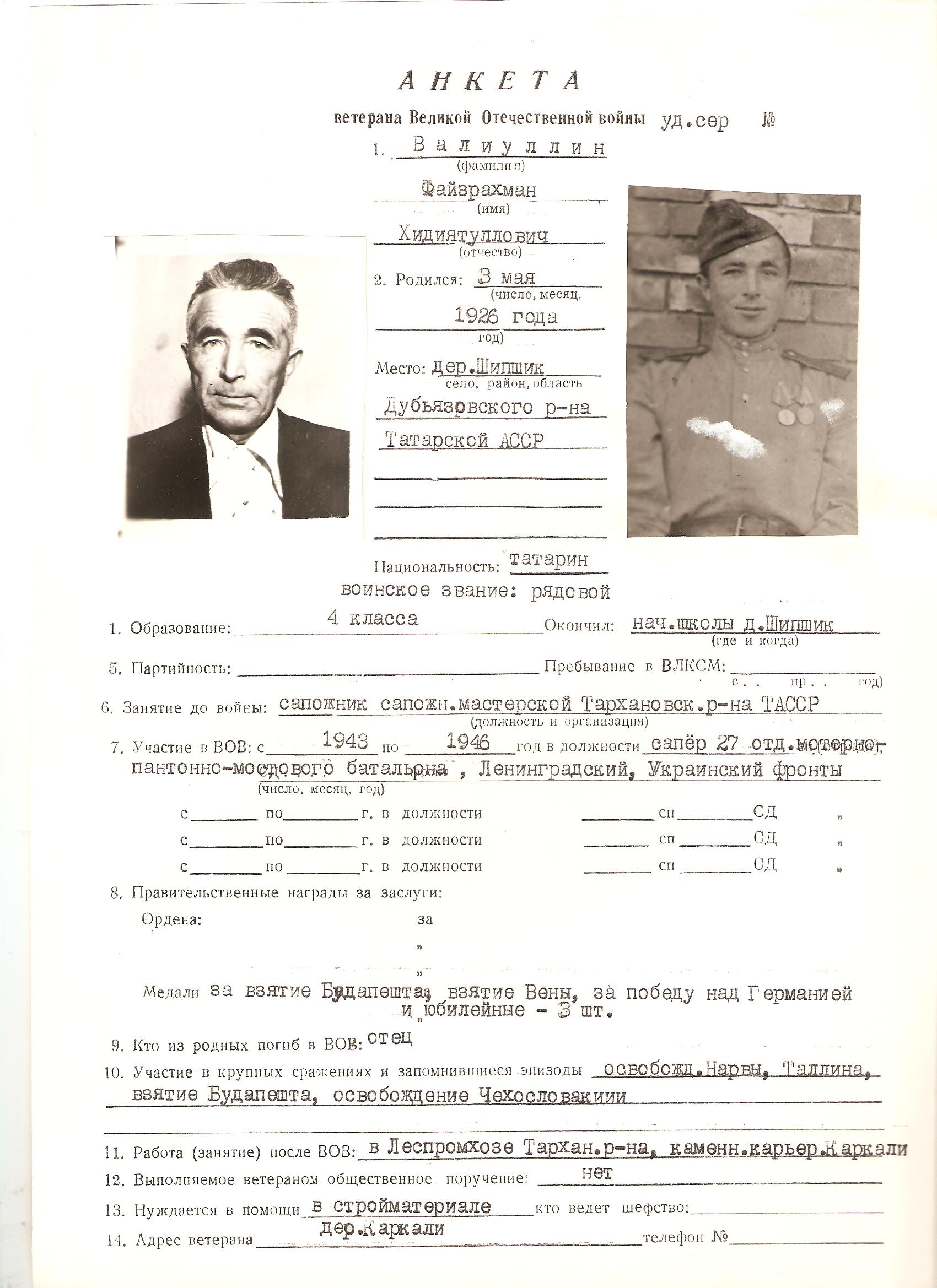 «Мой отец, Валиуллин Файзрахман Хидиятуллович родился ТАССР Арский район селе Шипшик 1926 году 3 сентября. Призывался Больше Тарханском районном военном комиссариате 1943 году 6 ноября. Ленинградский фронт. Участвовал в боях г. Будапешт, Польша. Был ранен 1944году.Награжден медалями «За взятие Вены», «За взятие Будапешта», «За победу над Германией». К сожалению, больше подробности не знаю. Умер 1995 году 16 сентября. Мы гордимся с нашим отцом и дедом.»