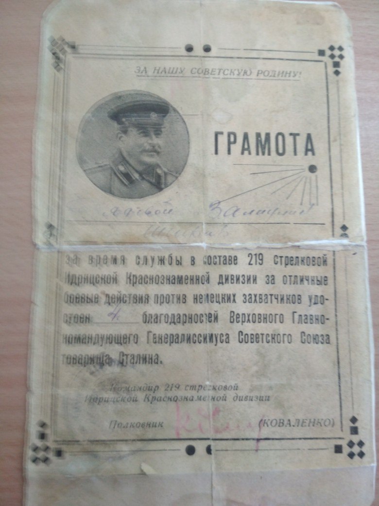 1. Медаль «За отвагу» №1195474. Приказ № 050 по 219-ой стрелковой Идрицской Краснознаменной дивизии (СИКД) от 29.08.1944года