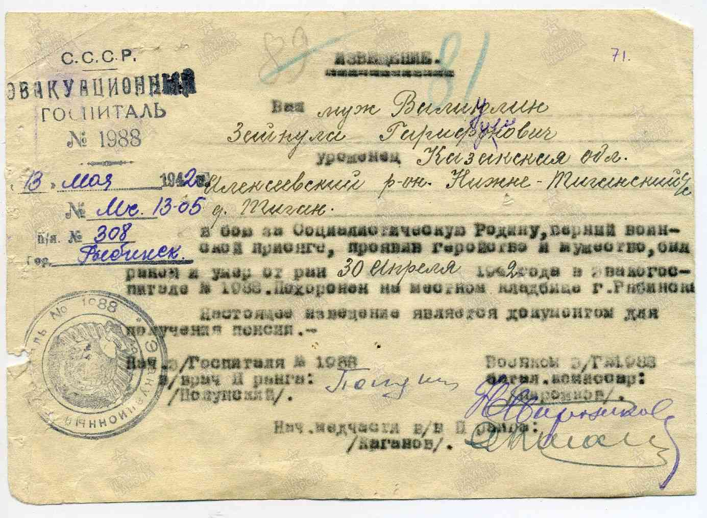 ВАЛИУЛЛИН Зайнулла Гарифуллович, с. Нижние Тиганы. Красноармеец, стрелок 23 СД 34 А Северо-Западного фронта. 21 апр. 1942 поступил со слепым осколочным ранением в ЭГ 1988, г. Рыбинск, Ярославская обл. Умер 30 апр. 1942. Похоронен на городском кл-ще.
