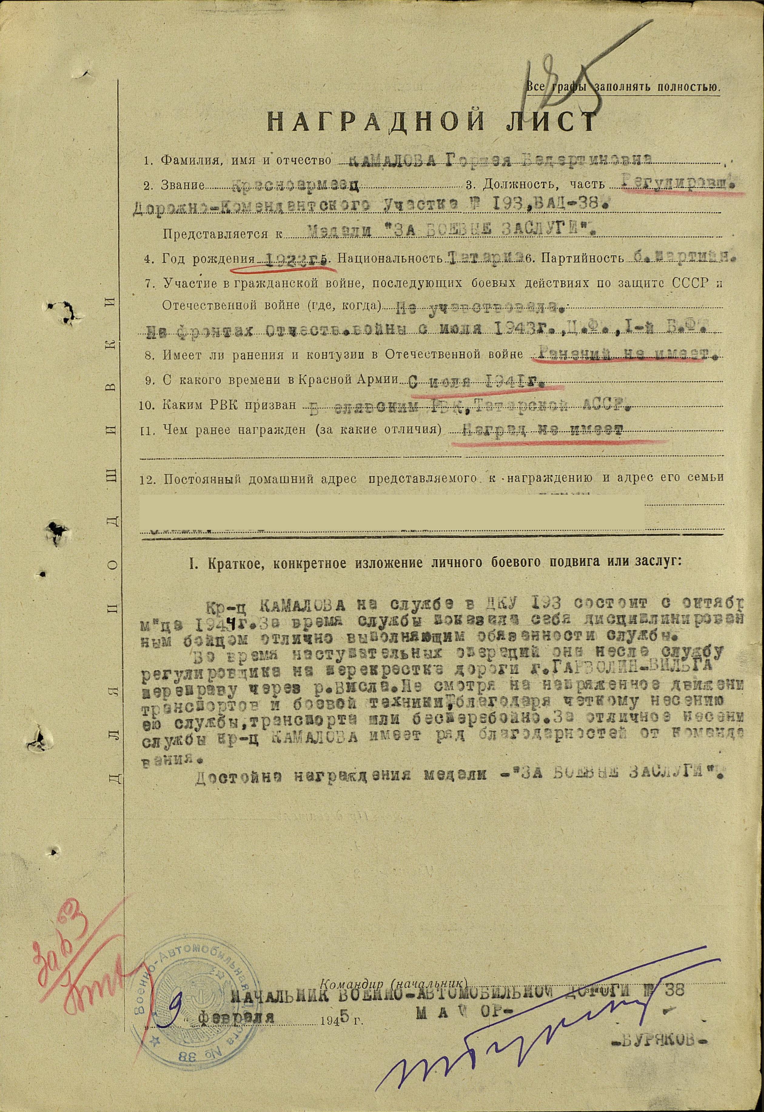 На фото - справа. ВАЛИУЛЛОВА (КАМАЛОВА) Гаршия Бадретдиновна, 1922, с. Большие Тиганы. Мобилизована Билярским РВК в 1941. Регулировщица дорожно-комендантского участка № 193 , ВАД--38 (военно-автомобильная дорога), красноармеец. Награждена медалью "За боевые заслуги", орденом Отечественной войны 2 ст. (1985 г.). После войны работала в сельском д/саду. Умерла в 2000 г. Похоронена в с. Большие Тиганы.
