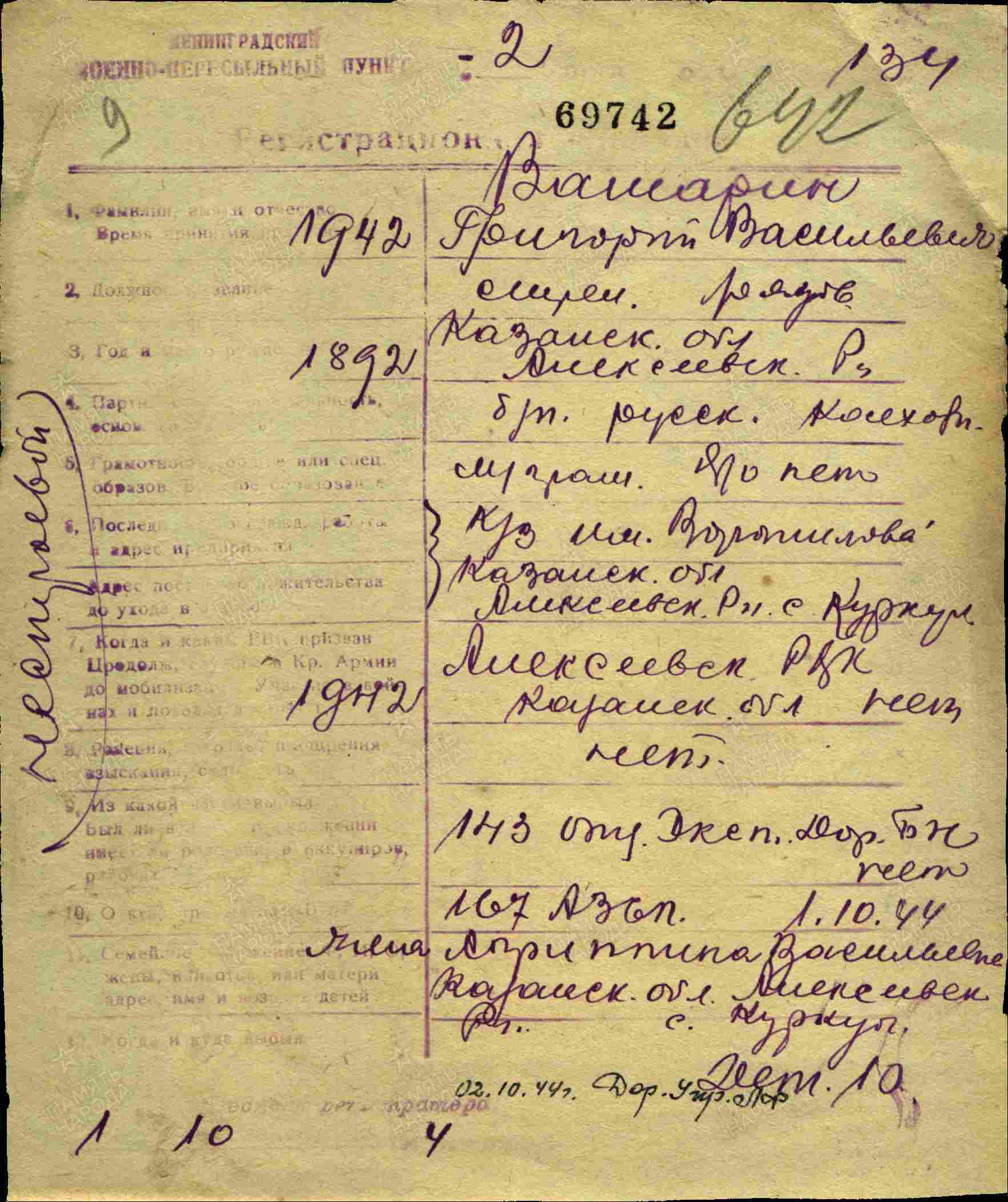 ВАШАРИН Григорий Васильевич, 1892, с. Куркуль. Мобилизован 9 дек. 142 Алексеевским РВК. Красноармеец, 143 отд. дорожно-эксплуатационный батальон Дорожного Управления Ленинградского фронта.