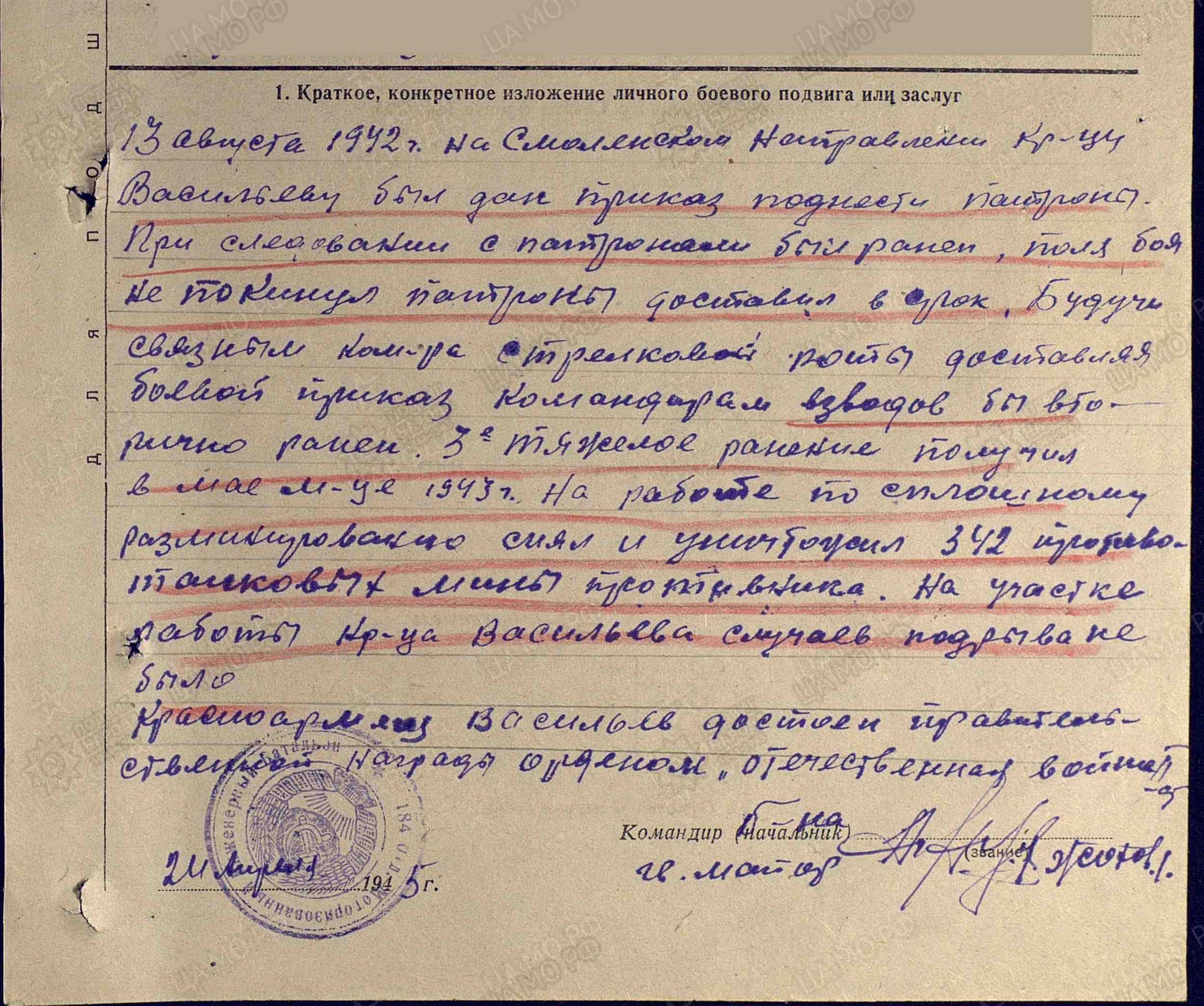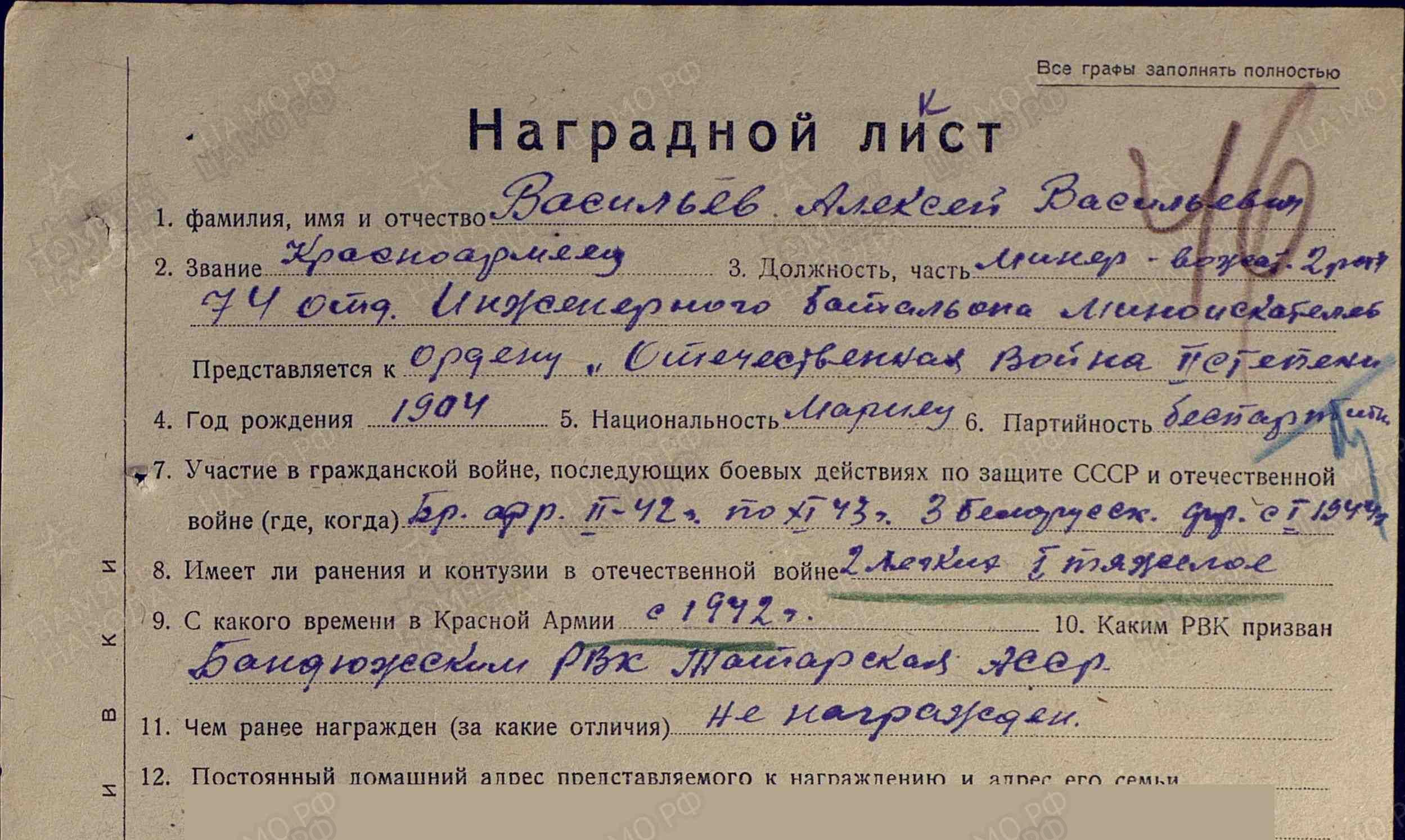 Красноармеец, минер 74 отдельного инженерного батальона миноискателей. Брянский, Третий Белорусский фронт. Два легких, одно тяжелое ранение.