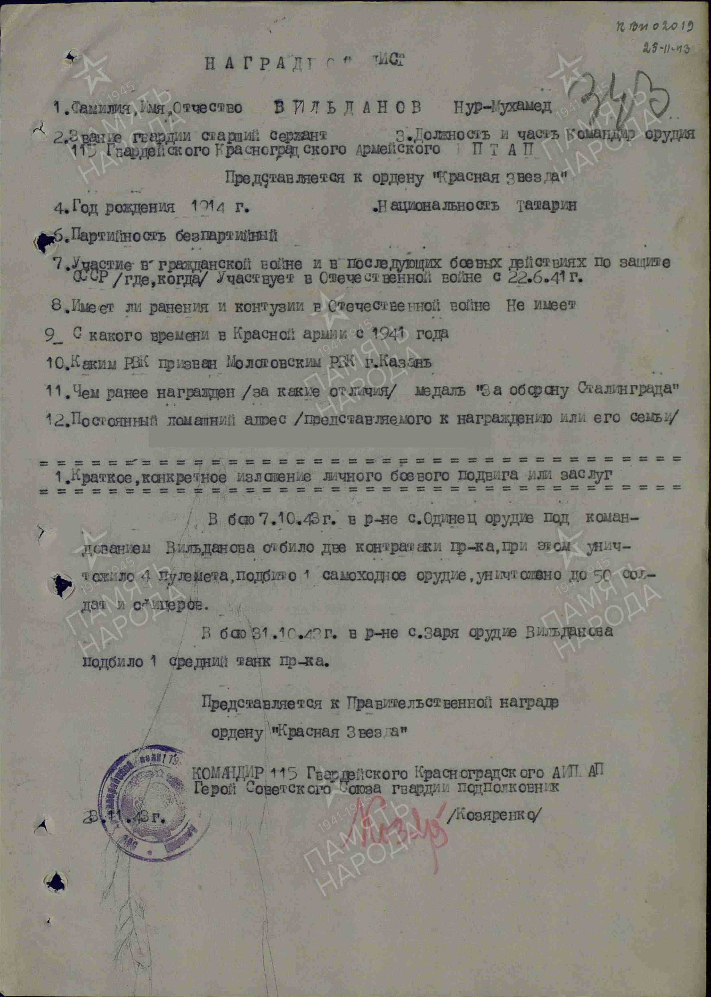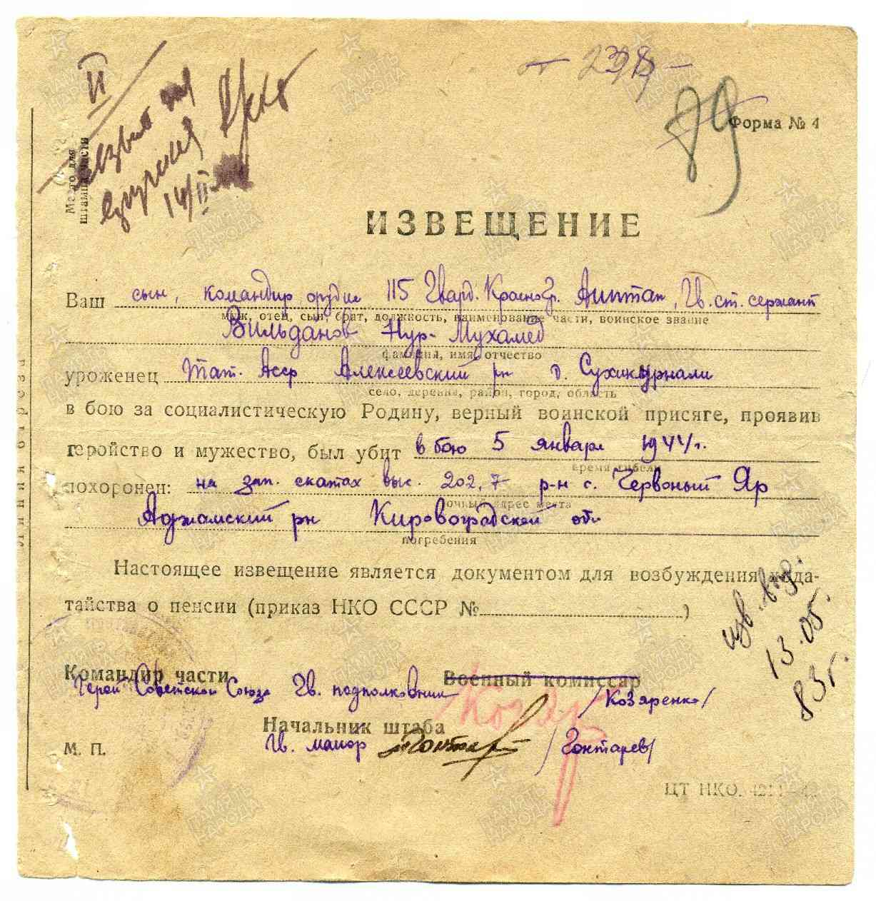 ВИЛЬДАНОВ Нурмухамед Хузиахметович, 1914, с. Сухие Курнали. Мобилизован Молотовским РВК г. Казань 1 нояб. 1941. Сержант, ком. орудия 500 ИПТАП 64 А Сталинградского/ Донского/ Воронежского фронта, гв. ст. сержант, 115 гв. армейский ИПТАП 7 гв. А Воронежского/ Степного фронта, 57 А 2 Украинского фронта. Награждён медалью «За оборону Сталинграда», орденом Красной Звезды. Погиб 5 янв. 1944, с. Червоний Яр, Аджамский (Кропивницкий) р-н, Кировоградская обл., УкрССР.