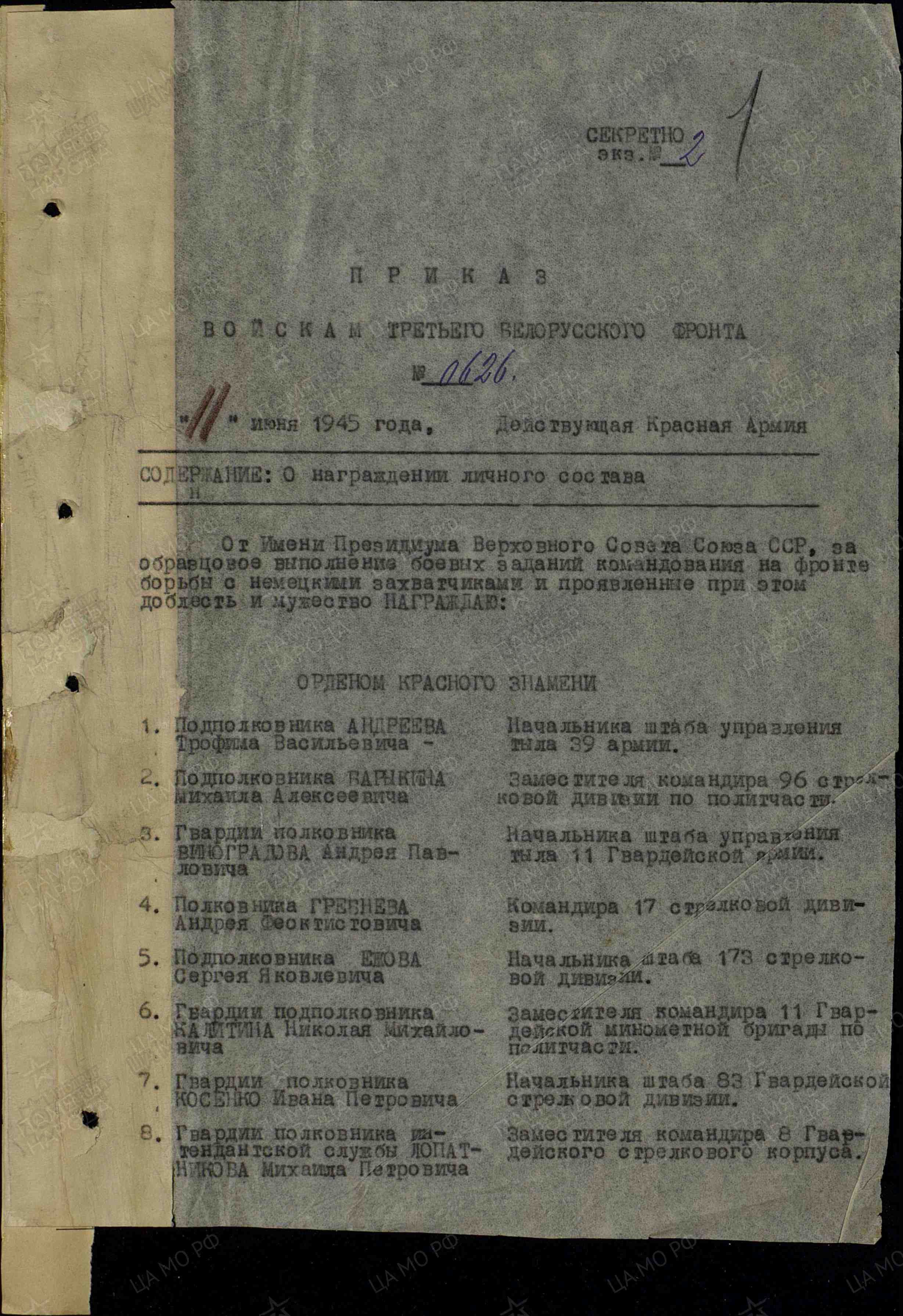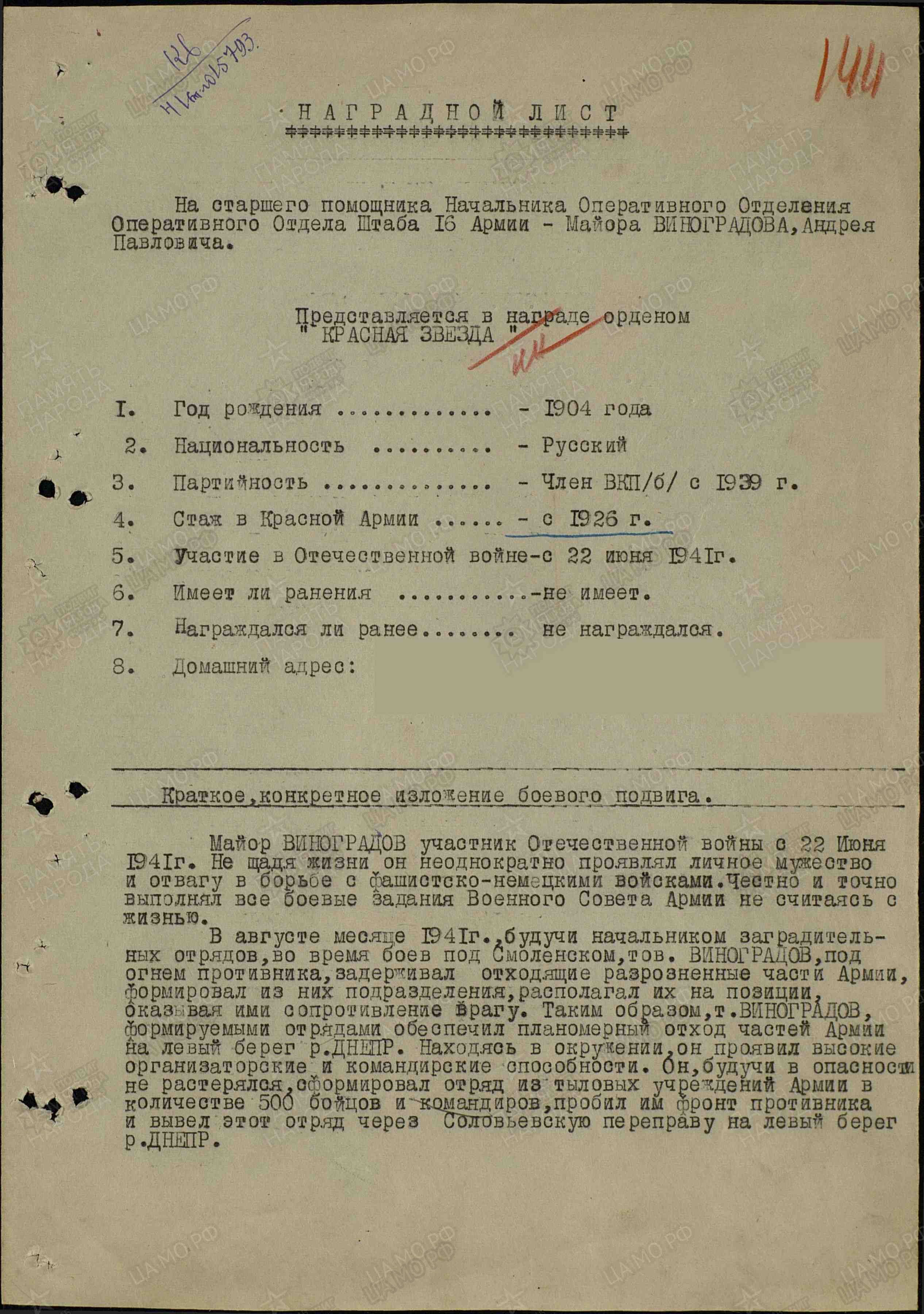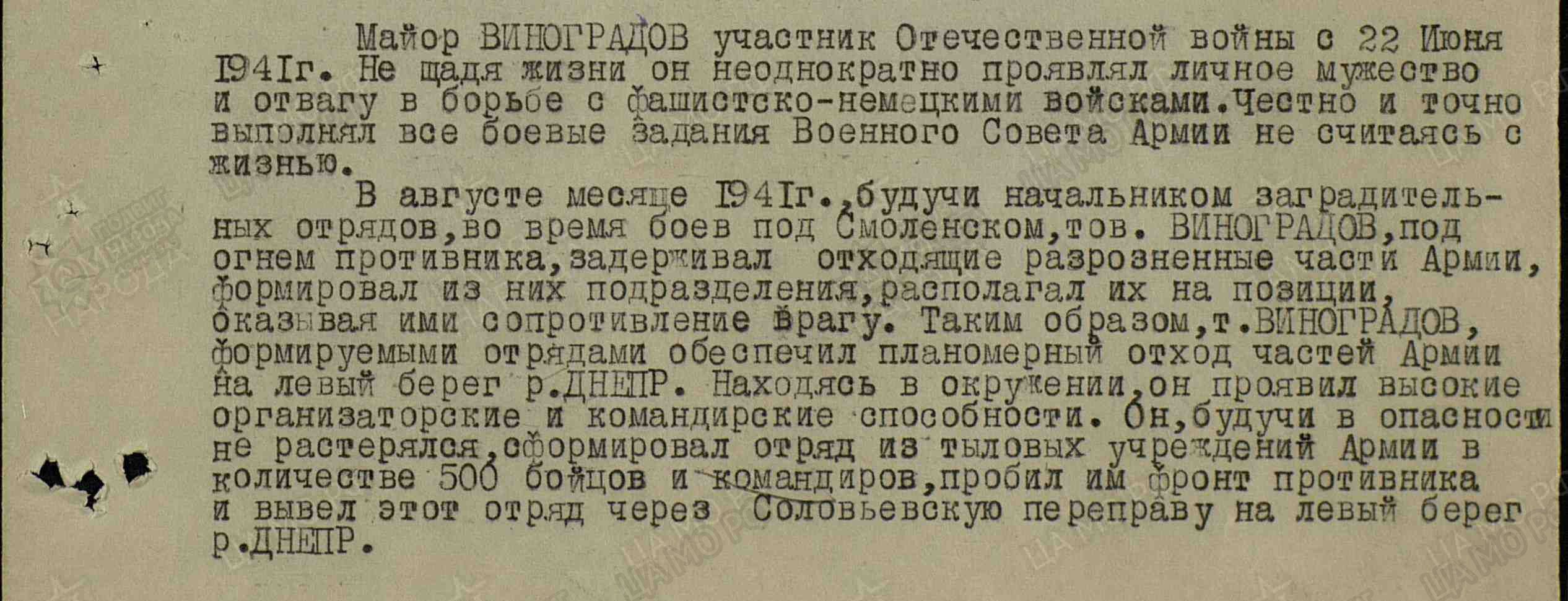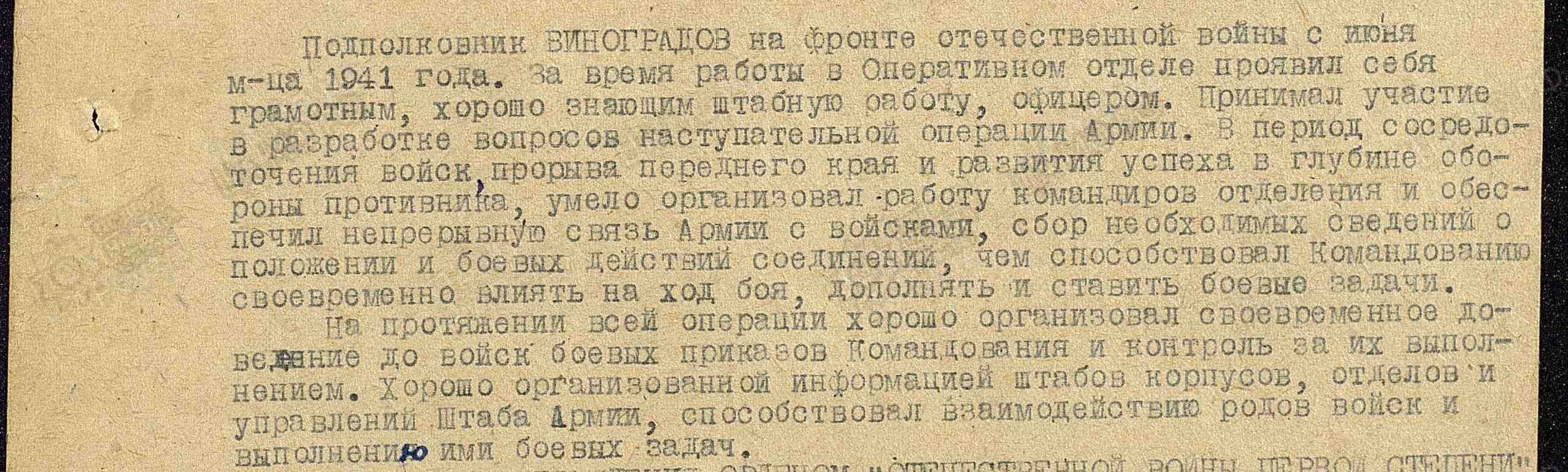 «В августе месяце 1941 года, будучи начальником заградительных отрядов, во время боев под Смоленском, тов.Виноградов, под огнем противника, задерживал отходящие разрозненные части Армии, формировал их них подразделения, располагал их на позиции оказывая ими сопротивление врагу. Таким образом, т.Виноградов формируемые отрядами обеспечил планомерный отход частей Армии на левый берег р.Днепр. Находясь в окружении, он проявил высокие организаторские и командирские способности. Он, будучи в опасности не растерялся, сформировал отряд из тыловых учреждений армии в количестве 500 бойцов и командиров, пробил им фронт противника и вывел этот отряд через Соловьевскую переправу на левый берег р.Днепр».