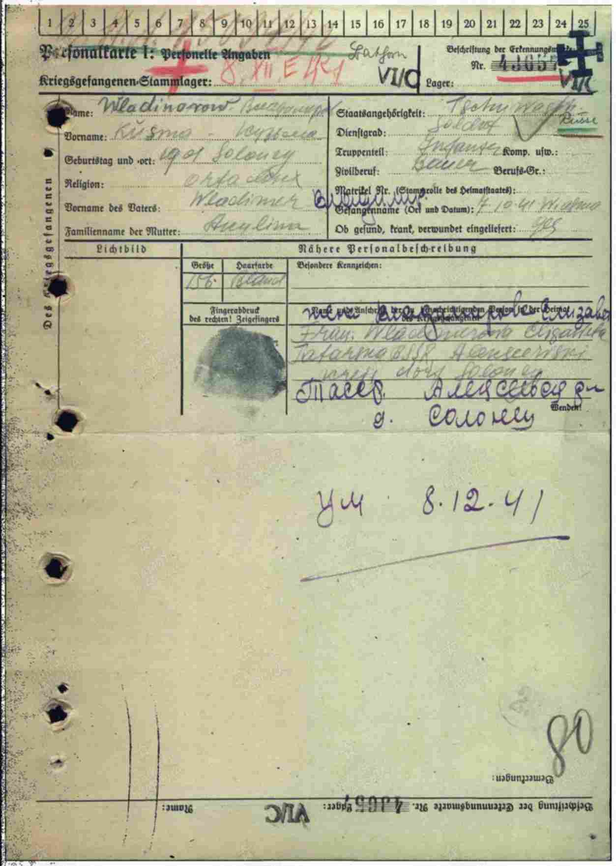 ВЛАДИМИРОВ Кузьма Владимирович, 1901, д. Солонцы. Мобилизован Алексеевским РВК 6 сент. 1941. Красноармеец, пехотинец. Попал в плен 7 окт. 1941 под г. Вязьма. Содержался в лагере военнопленных VI C, Батхорн, Нижняя Саксония, Германия. Умер 8 дек. 1941.