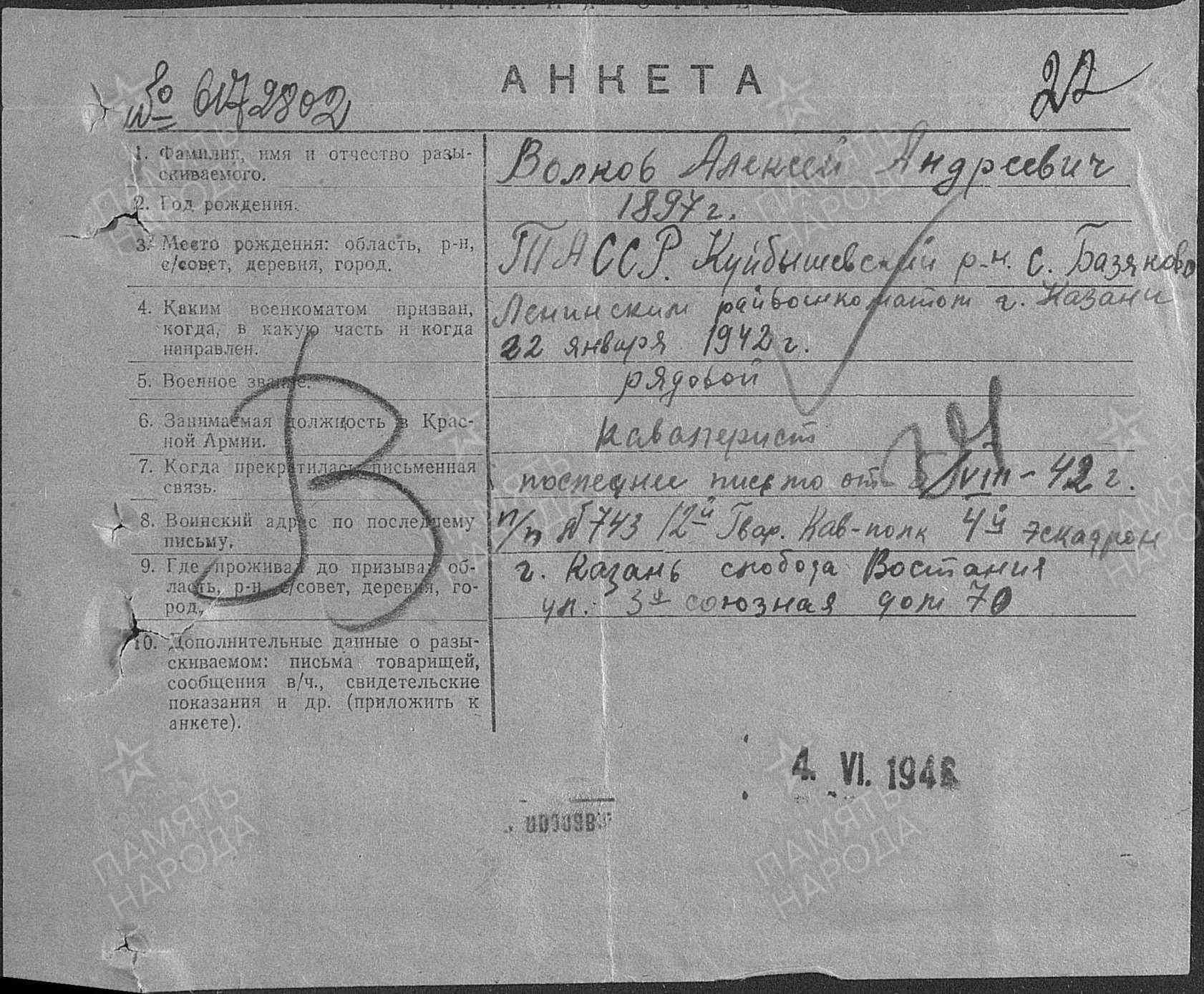 ВОЛКОВ Алексей Андреевич, 1897, с. Базяково. Мобилизован 22 янв. 1942 Ленинским РВК г. Казань. Гв. красноармеец, 12 гв. КавП 3 гв. КавД 2 гв. КавК Западного фронта. Последнее письмо от 5 авг. 1942. Учтён пропавшим без вести в сент. 1942.