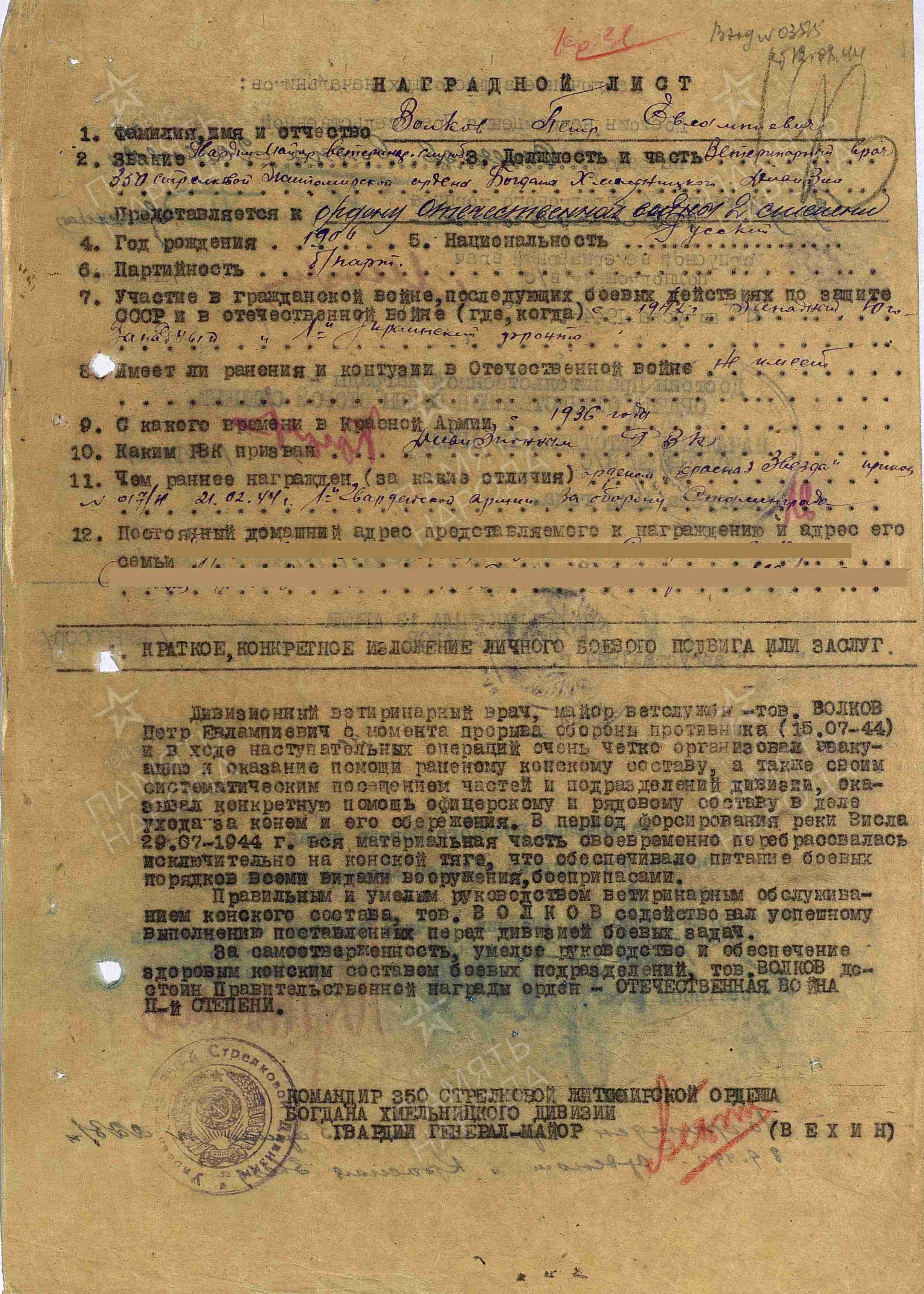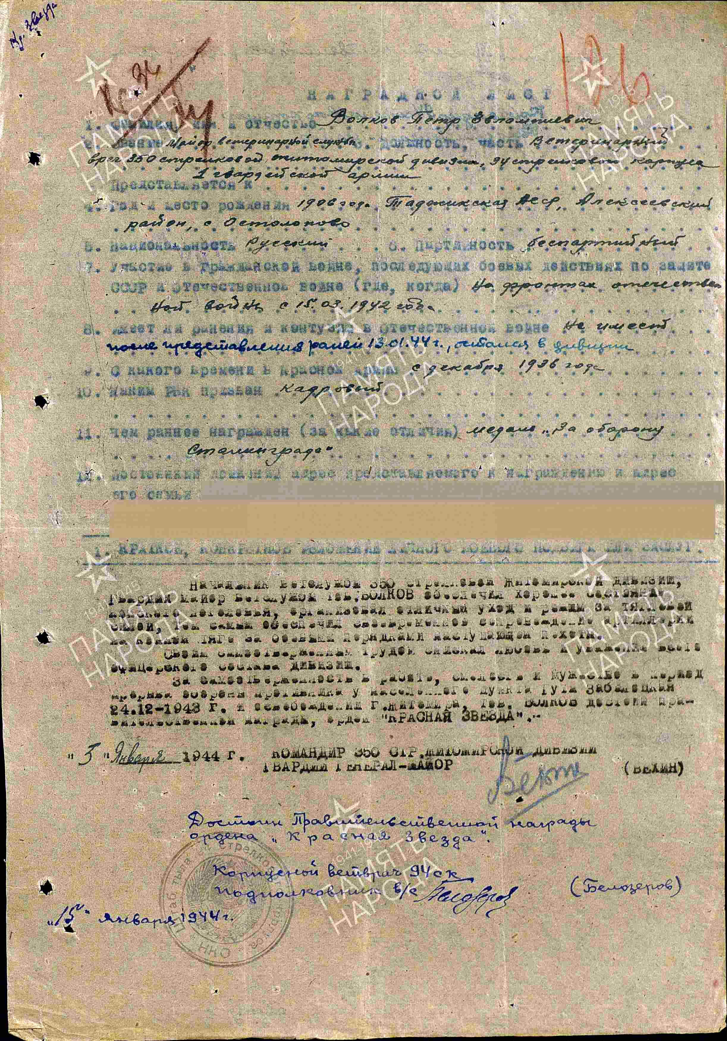 ВОЛКОВ Пётр Евлампиевич, 1905, с. Остолопово. Кадровый военный с марта 1932. Призван Джидинским РВК Бурят-Монгольской АССР. Служил в составе 97 СД и 209 СД Забайкальского фронта. Военветврач 3 ранга. На Западном фронте с 15 марта 1942. Должности: ВрИД нач. ЭВЛ 602 8 гв. А Юго-Зап. фронта, гв. майор вет./ сл., дивизионный ветеринарный врач 350 СД в составе 13 А/ 1 гв. А/ 58 А 1 Украинского фронта. Ранен 13 янв. 1944. Вышел в отставку 4 фев. 1946 в звании «гв. подполковник ветеринарной службы». Награждён медалью «За оборону Сталинграда», двумя орденами Красной Звезды.
