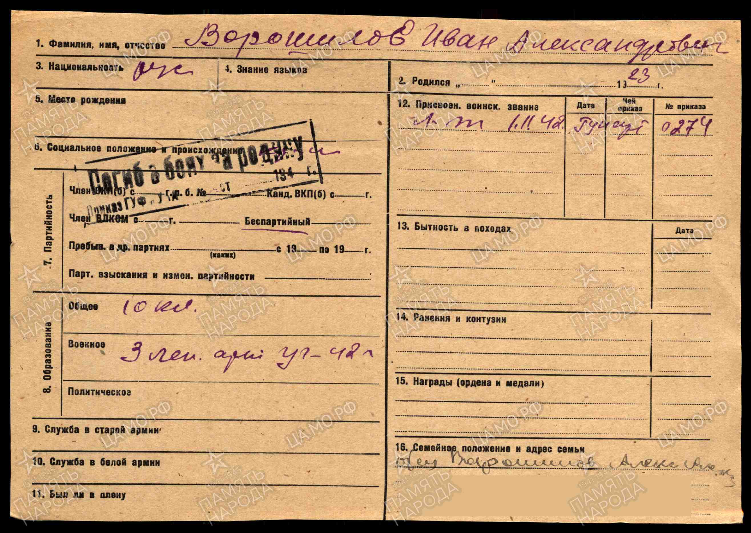 ВОРОШИЛОВ ИВАН АЛЕКСАНДРОВИЧ 1923