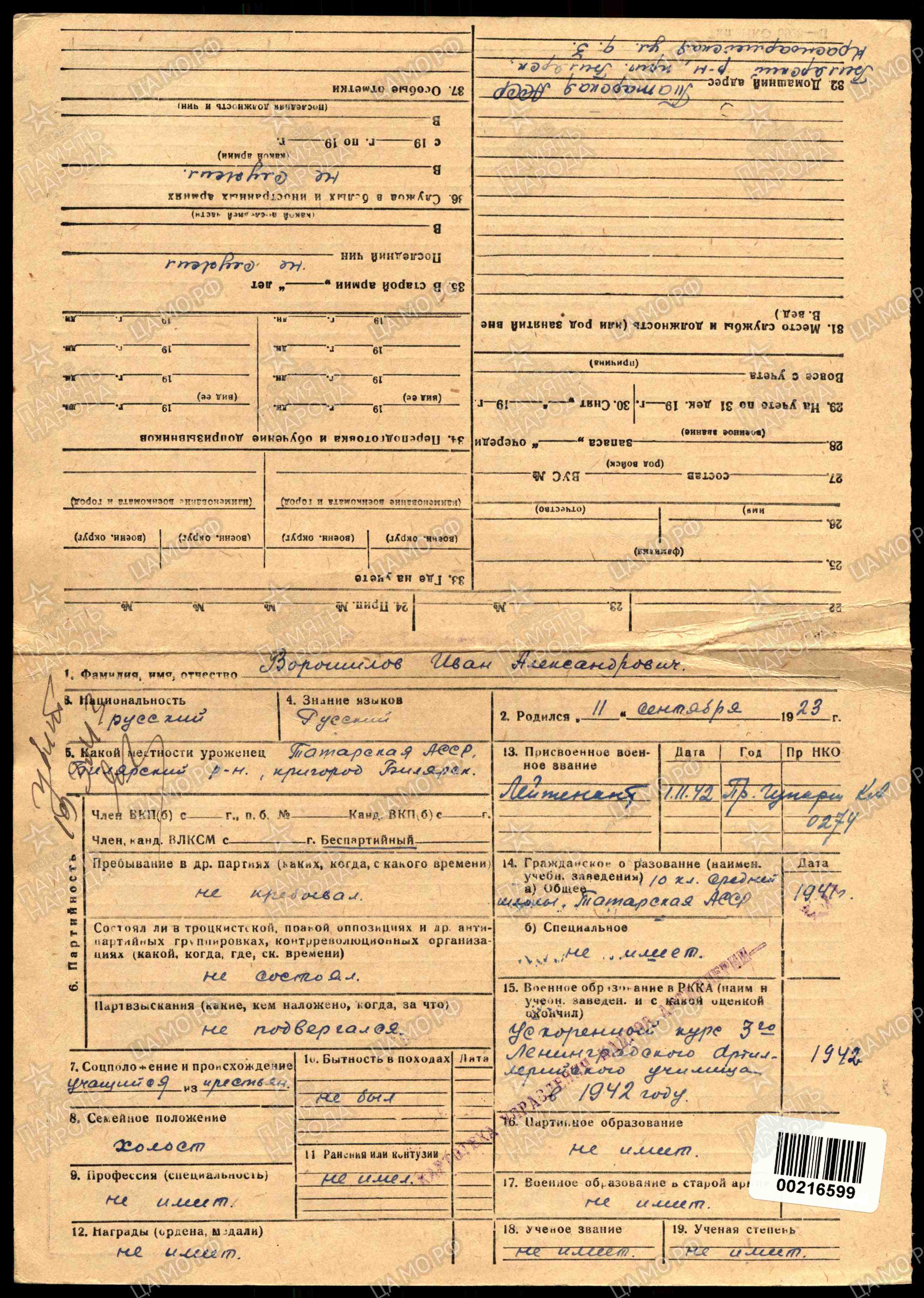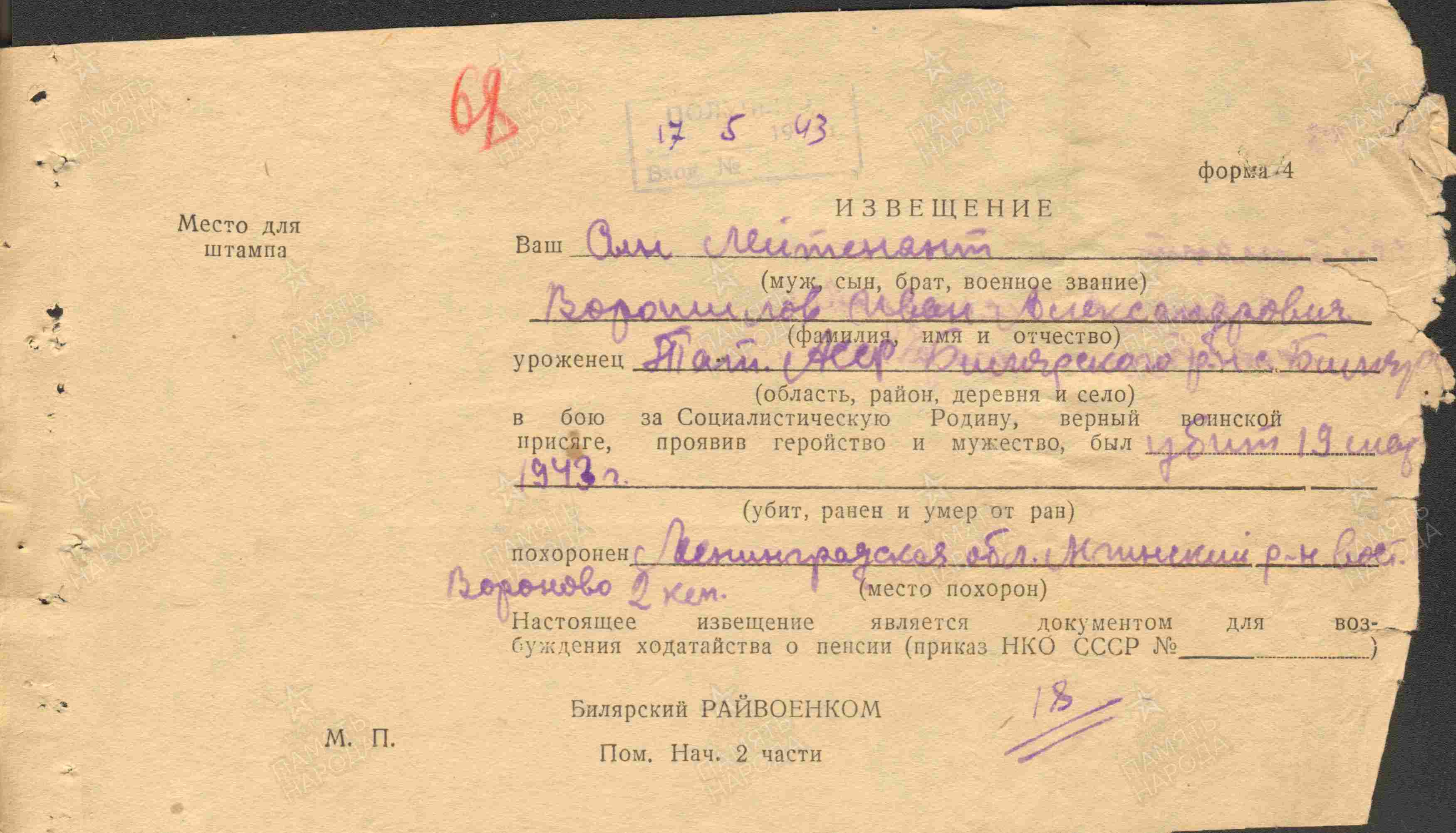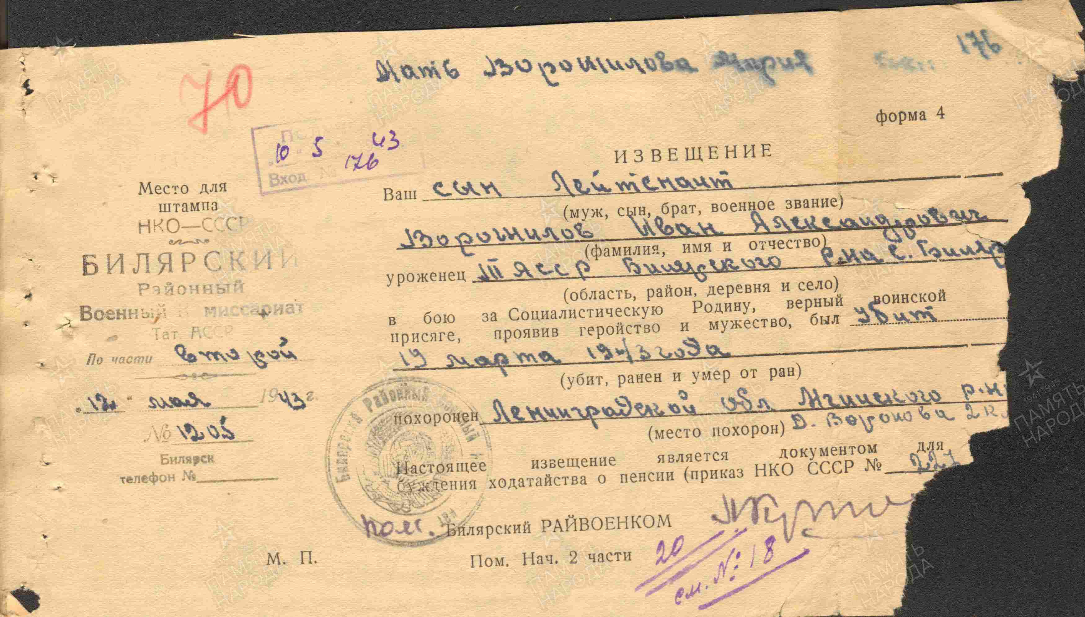 ВОРОШИЛОВ Иван Александрович, 1923, с. Билярск. Член ВЛКСМ. Мобилизован Билярским РВК 22 окт. 1941/2 фев. 1942. Окончил ускоренный курс 3 Ленинградского артиллерийского училища. На фронте с 17 сент. 1942. Лейтенант, ком. огневого взвода 792 АП 256 СД 8 А Волховского фронта. Погиб 12 марта 1943, д. Вороново, Мгинский р-н, Ленинградская обл. Увековечен на мемориале «Новая Малукса», Кировский р-н, Лен. обл.