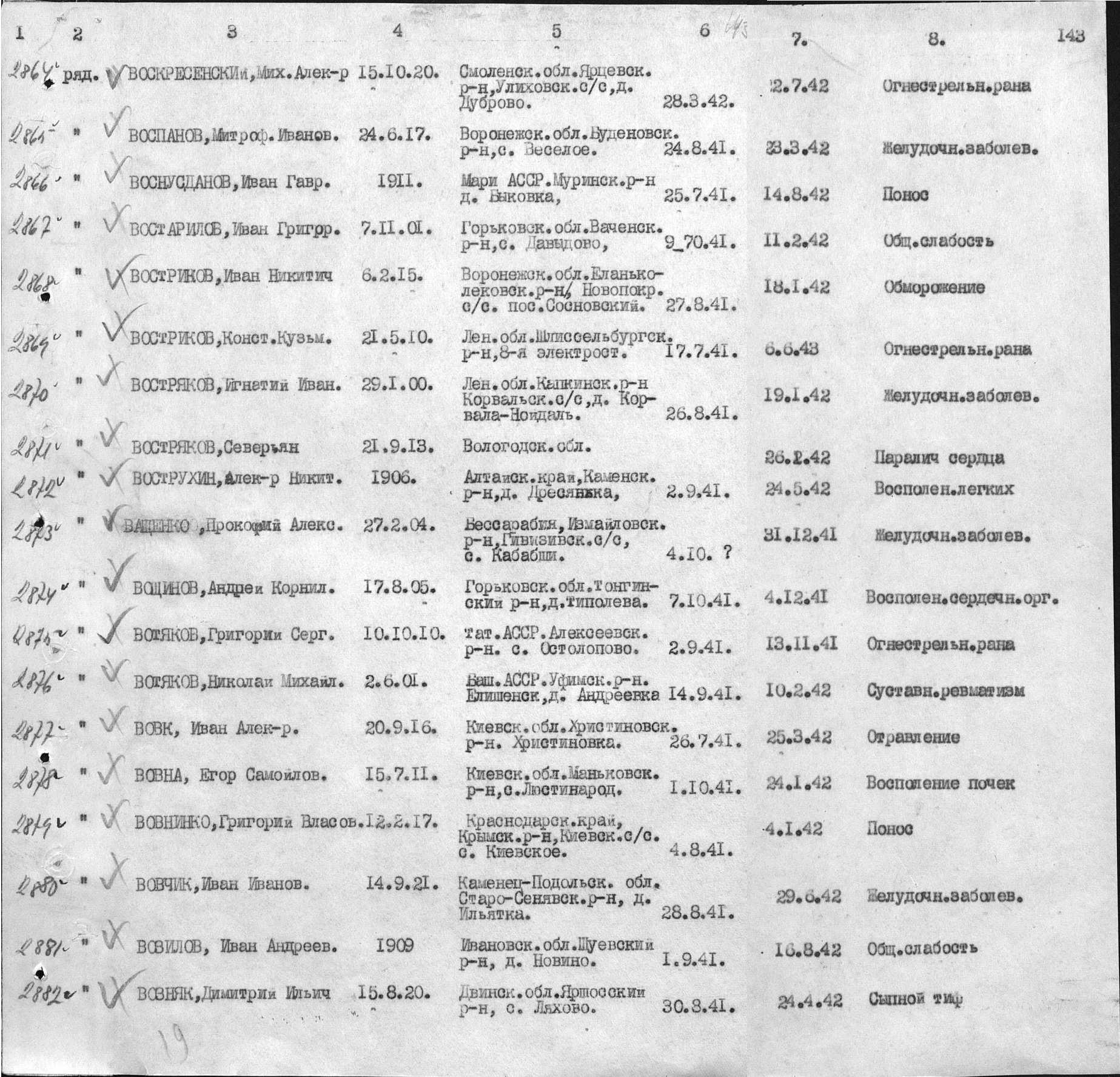 ВОТЯКОВ Григорий Сергеевич, 1910, с. Остолопово. Мобилизован 6 июля 1941 Алексеевским РВК. Красноармеец, 951 СП 265 СД 23 А Ленинградского фронта. Попал в плен 2 сент. 1941 у п. Сяркисало (Беличье), волость Ряйсяла (Мельниково, Приозёрский р-н), Ленинградская обл. Содержался в финском лагере советских военнопленных № 20. Умер 13 нояб. 1941 от огнестрельного ранения.