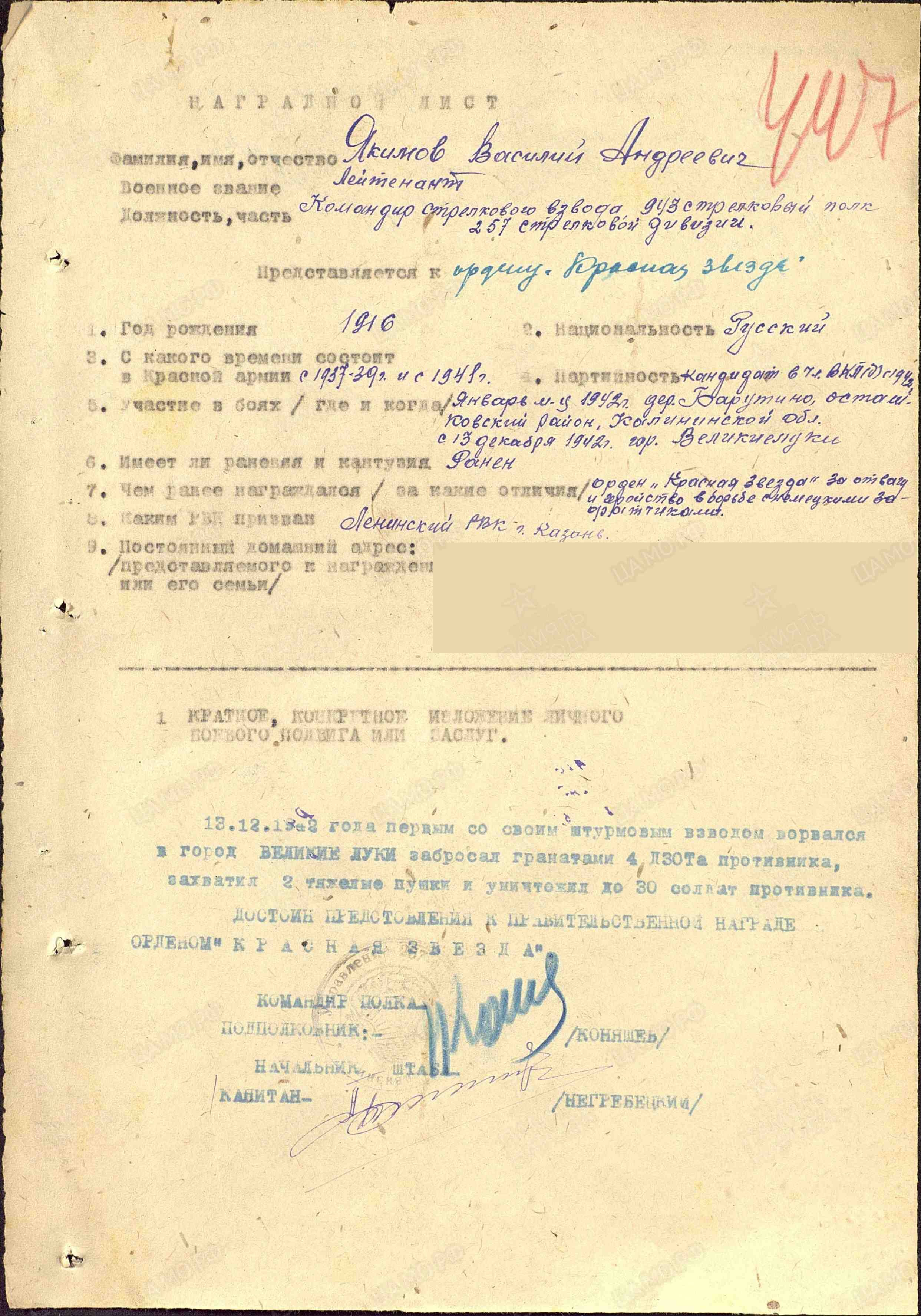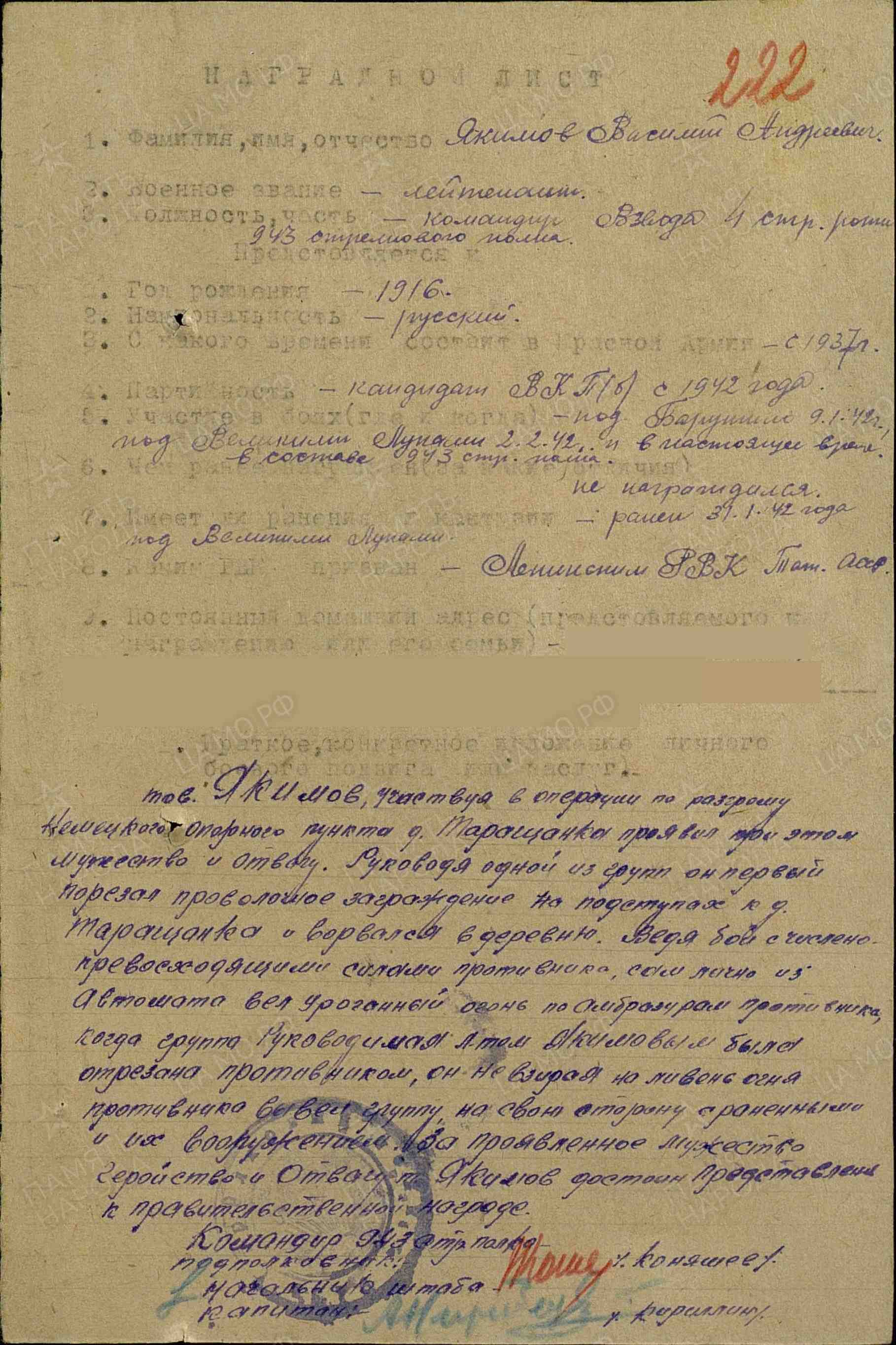ЯКИМОВ Василий Андреевич, 1916, д. Сабакайка. Мобилизован Ленинским РВК г. Казань в 1937г. Лейтенант, командир взвода 943 СП 257 СД Калининского Фронта. Ранен 31 января 1942г. Награждён двумя орденами Красной Звезды.