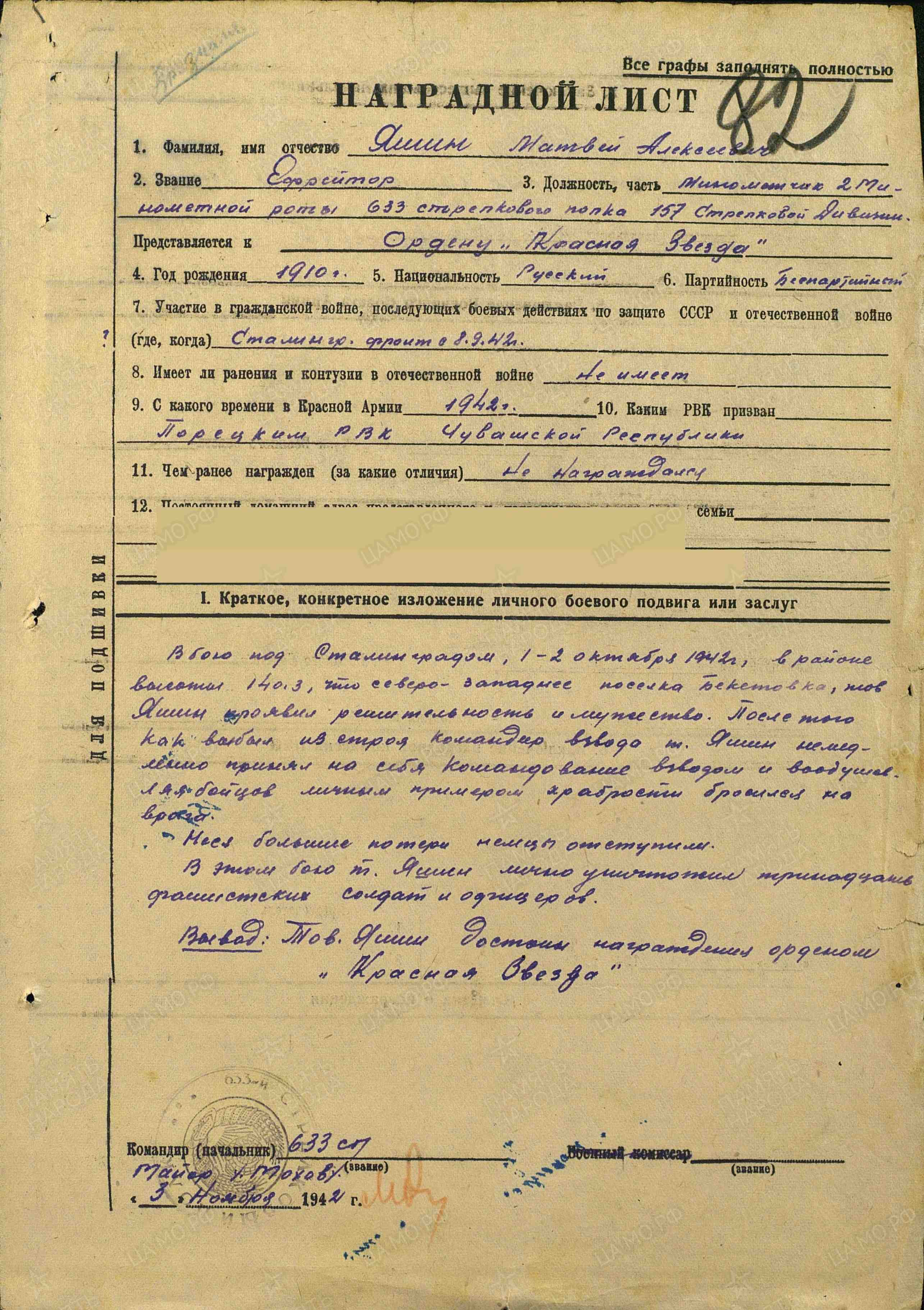 ЯШИН Матвей Алексеевич, 1910, с. Лебедино. Мобилизован Порецким РВК ЧувАССР в 1942. Ефрейтор, миномётчик миномётной роты 633 СП 157 СД 64 А Сталинградского фронта. В бою за высоту 140,3 северо-западнее п. Бекетовка 1 и 2 октября 1942г. принял на себя командование взводом, заменив выбывшего офицера. За героизм приказом № 108-Н по Сталинградскому фронту в дек. 1942 награждён орденом Красной Звезды, также медалью "За оборону Сталинграда".