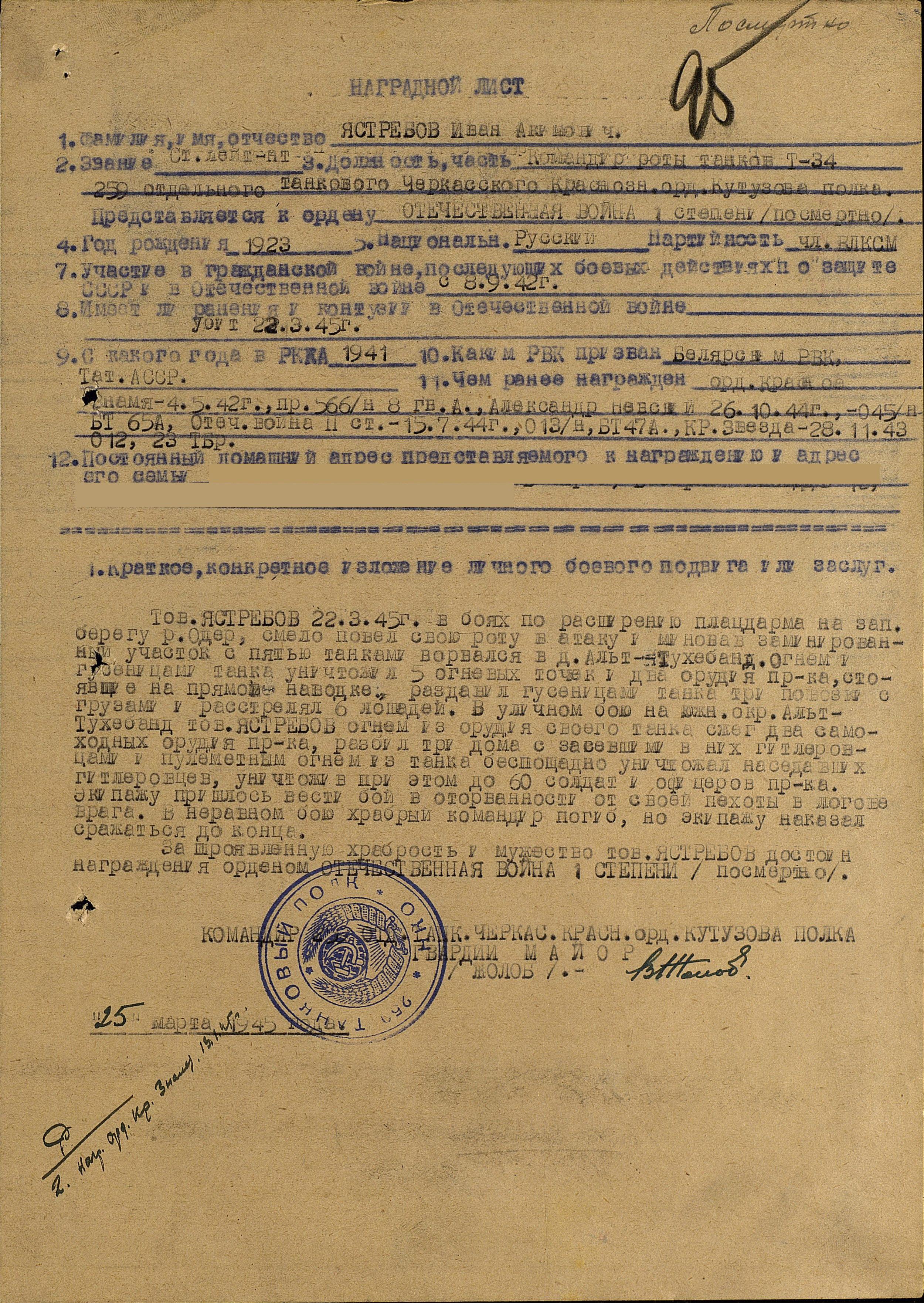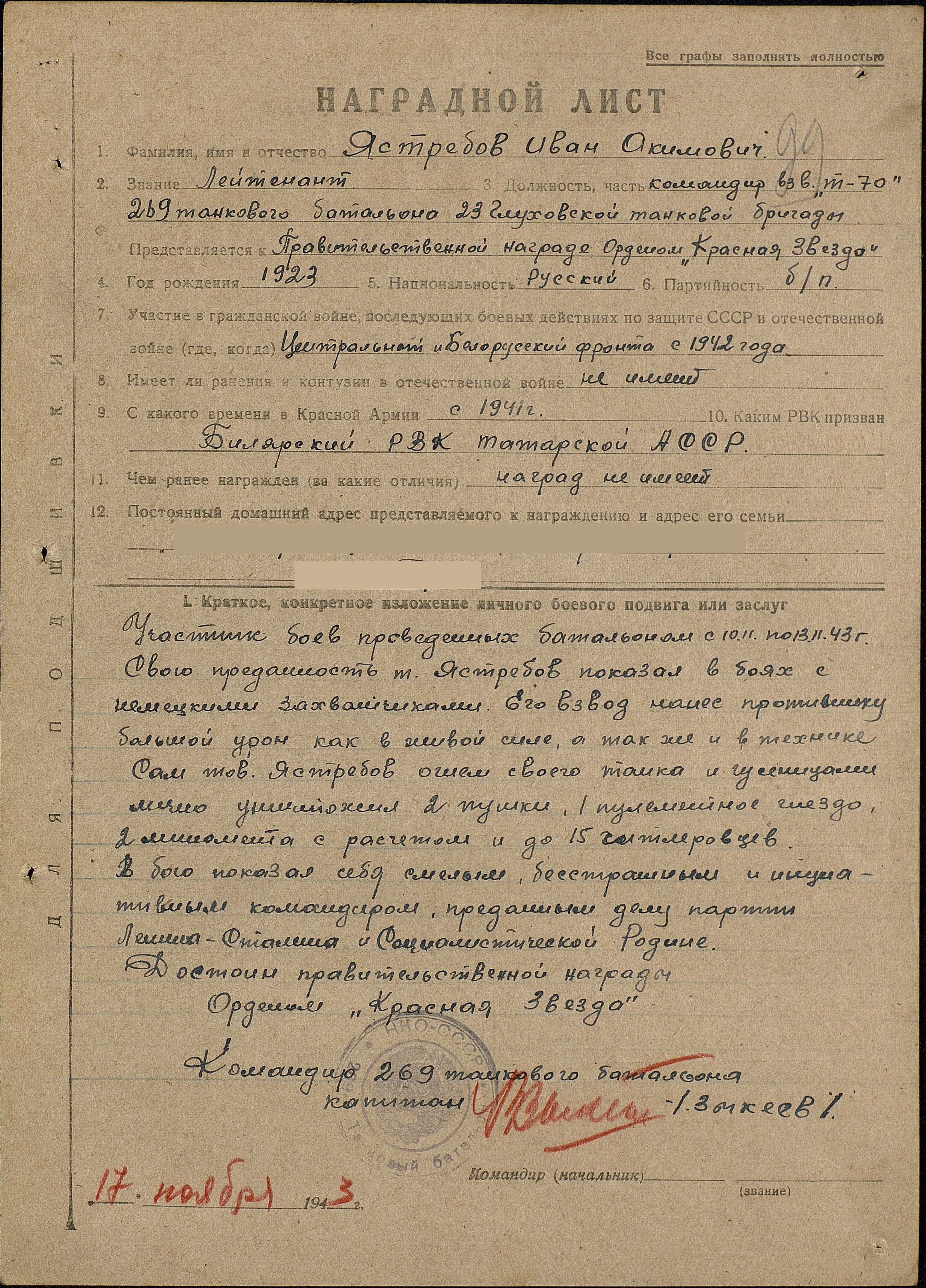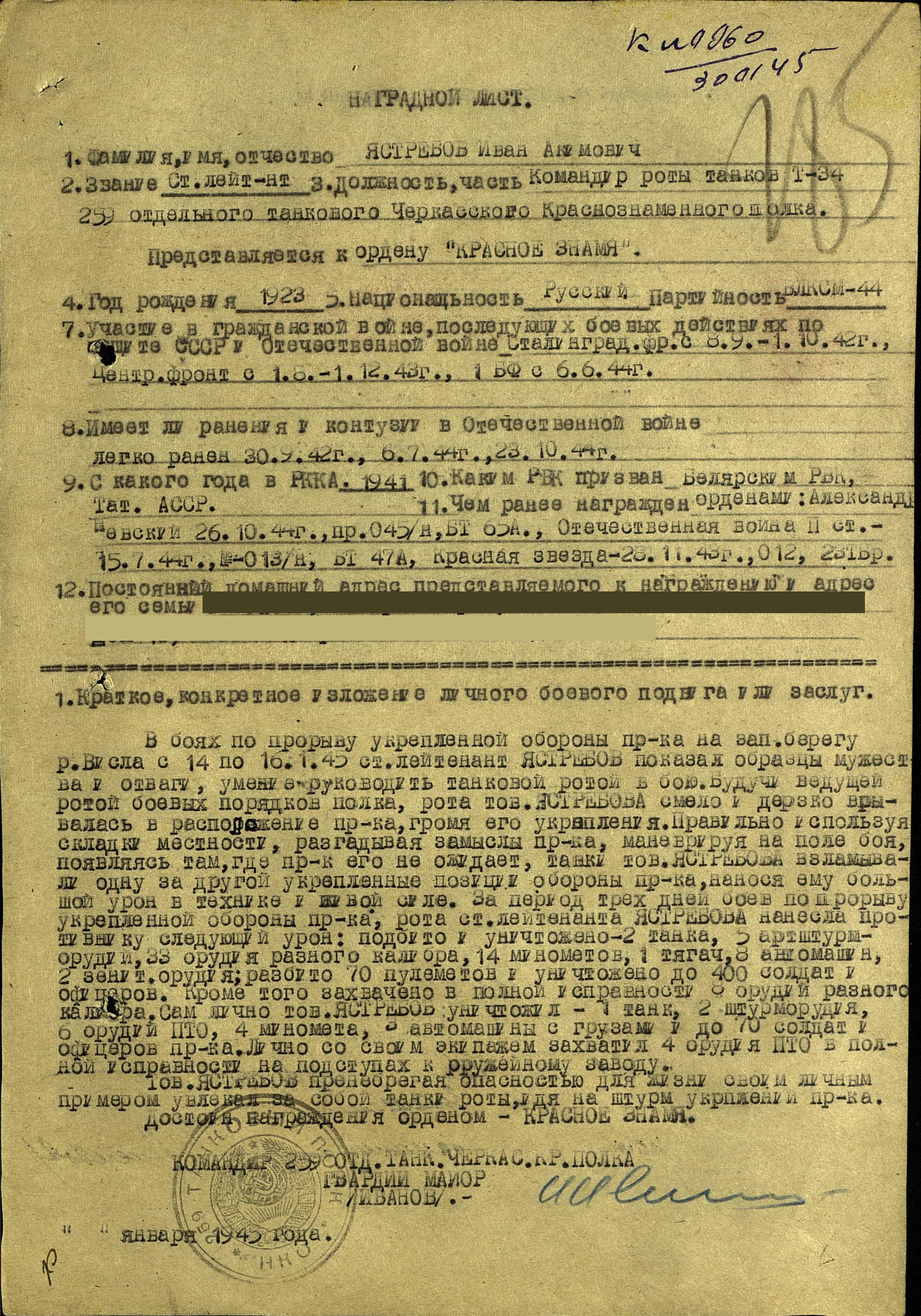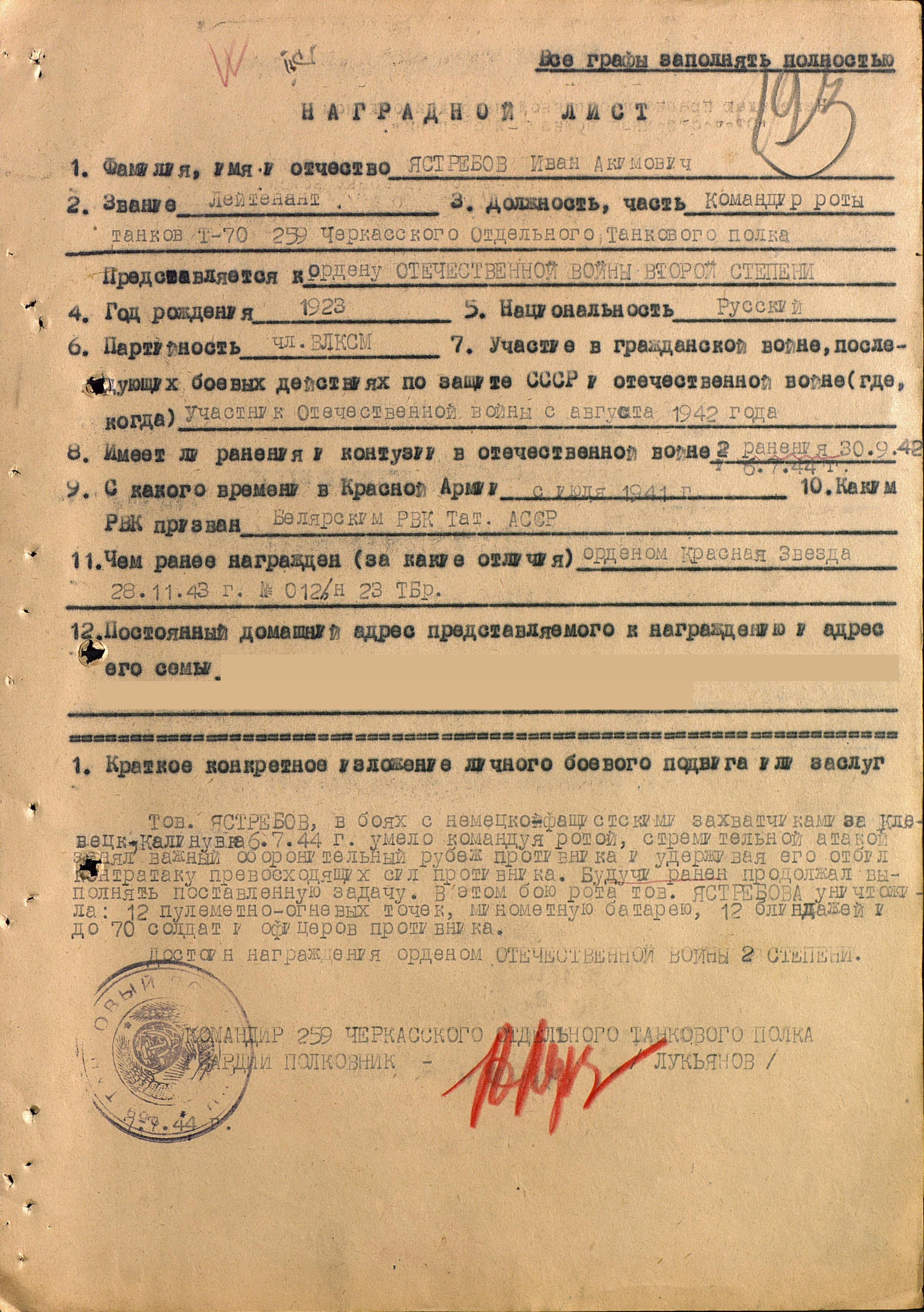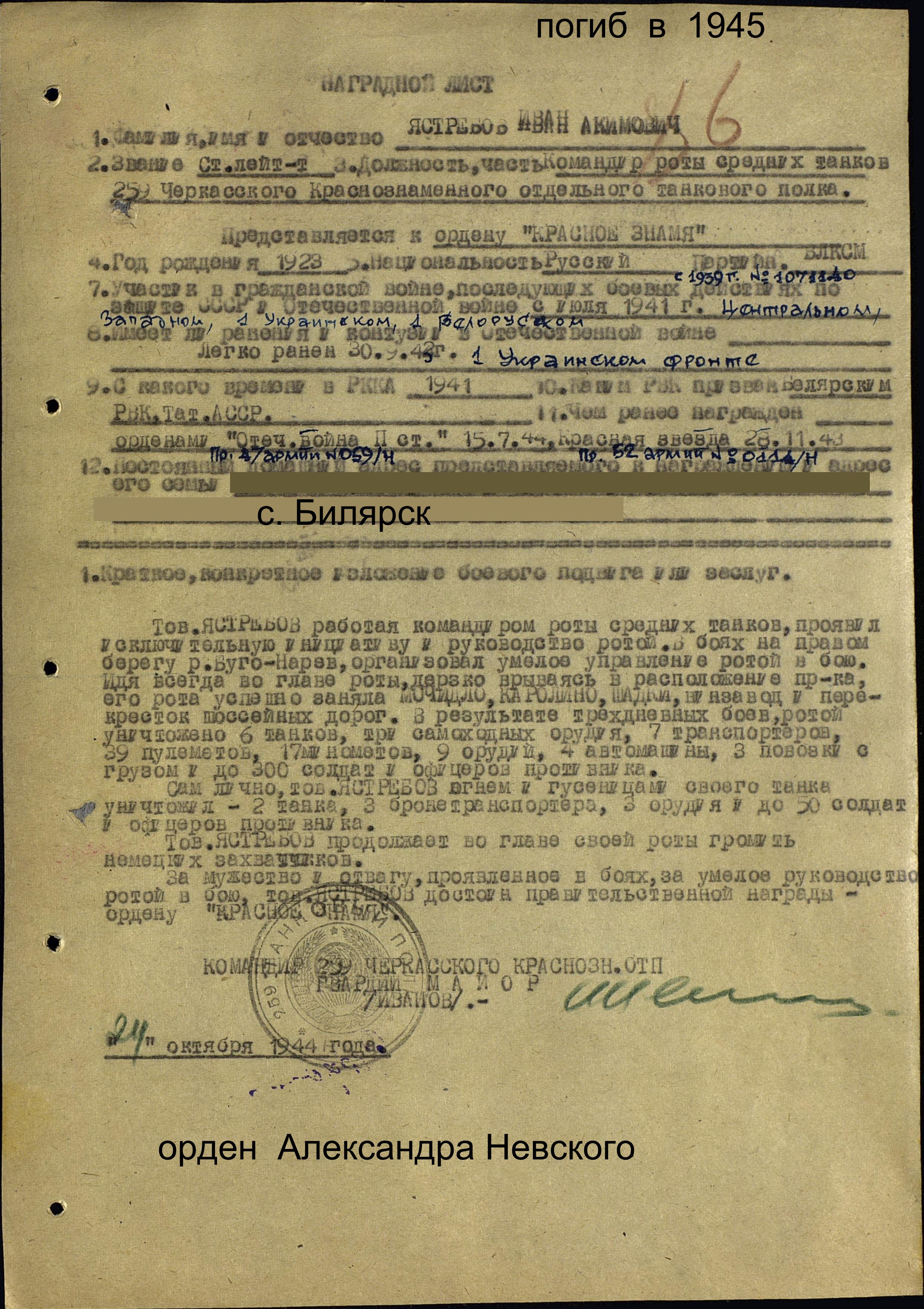 ЯСТРЕБОВ Иван Акимович, 1923, с. Билярск. Мобилизован Билярским РВК в 1941. С авг. 1942 воевал на Сталинградском, Центральном, Западном, Белорусском, 1 Украинском, 1 Белорусском фронтах. Член ВЛКСМ. Ранен 30 сент. 1942, 6 июля 1944, 23 окт. 1944. Лейтенант, ком. взвода танков Т-70 269 танкового батальона 23 ТБр 52 А, ком. роты танков Т-70 259 отд. ТП 47 А, ст. лейтенант, ком роты средних (Т-34) танков 259 отд. ТП 65 А. Награждён орденами Красной Звезды, Отечественной войны 2 ст., Александра Невского, Красного Знамени, Отечественной войны 1 ст. (посмертно). Погиб 22 марта 1945 в бою за д. Альт-Тухебанд на зап. берегу р. Одер. Похоронен в могиле № 147, ул. Вальчака, г. Гожув Велькопольский, Польша.