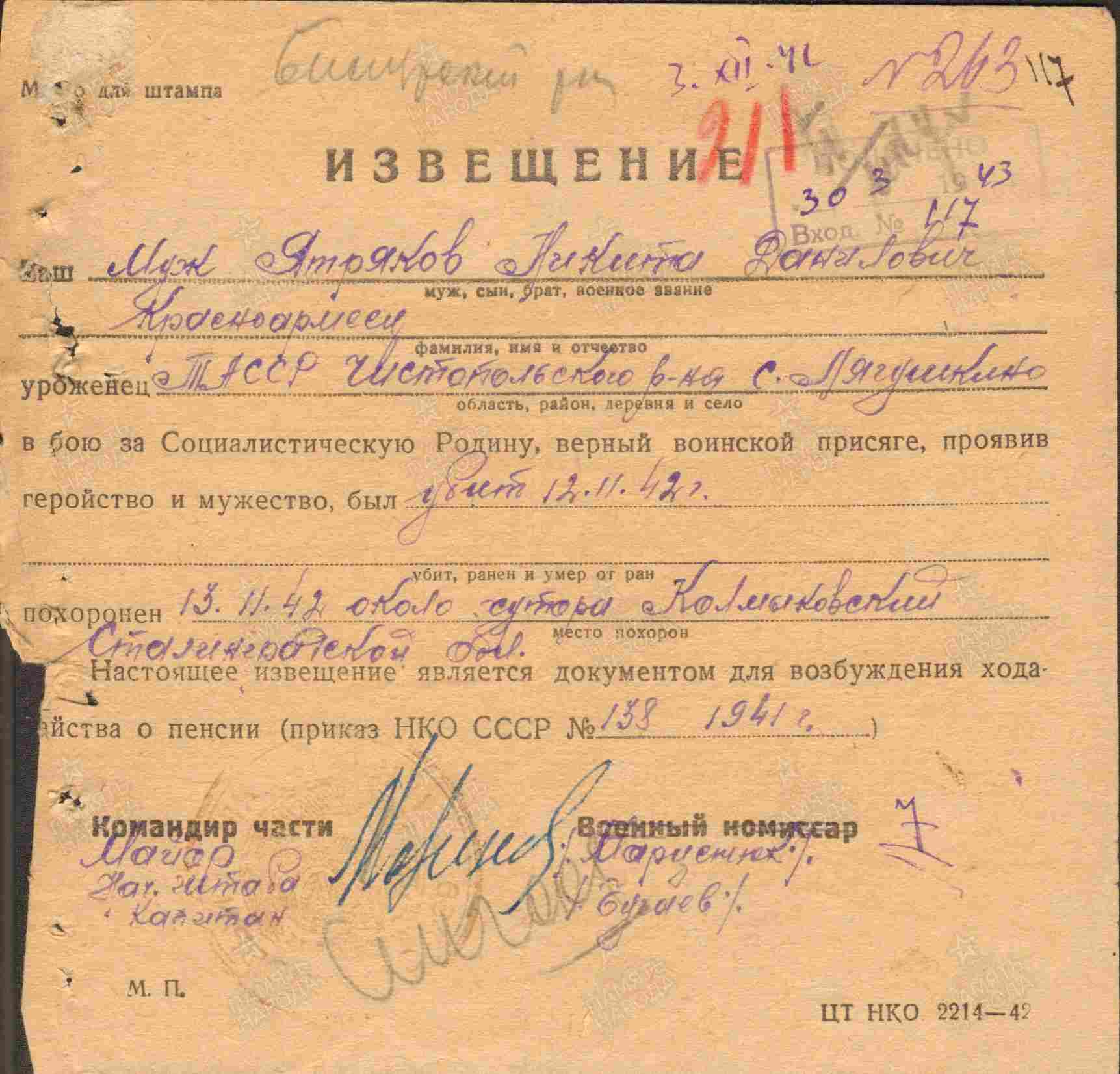 ЯТРЯКОВ Никита Данилович, 1912, с. Лягушкино. Мобилизован 28 авг. 1941 Молотовским РВК г. Казань. Красноармеец, 634 СП 119 СД 5 ТА Брянского/ Юго-Западного фронта. Погиб 21 нояб. 1942 в ходе контрнаступления советских войск под Сталинградом, хут. Калмыковский, Кагановичский (Клетский) р-н, Сталинградская обл.