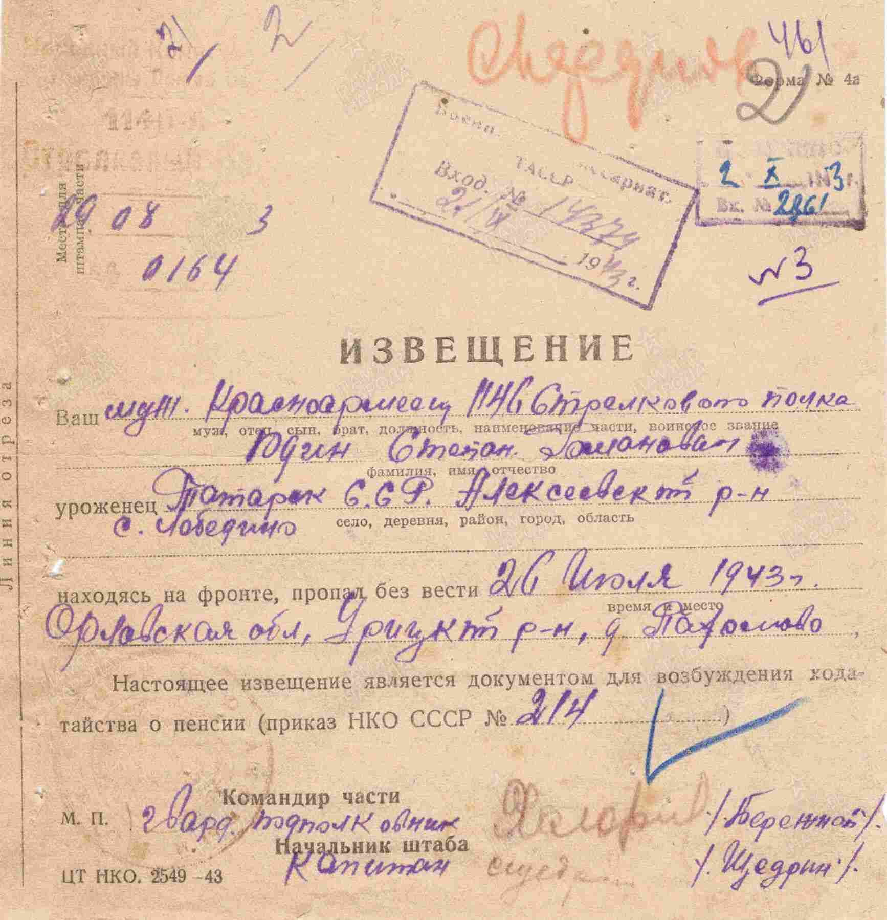ЮДИН Степан Романович, 1902, с. Лебедино. Мобилизован 28 сент. 1941 Бауманским РВК г. Казань. Красноармеец. Воевал в составе 918 АП 356 СД 61 А Западного фронта, 283 СД/ 1146 СП 342 СД 3 А Брянского фронта. Участник битвы на Курской дуге. Учтён пропавшим без вести 26 июля 1943 у д. Пахомово, Орловская обл. Числится похороненным в д. Башкатово, Мценский р-н, Орловская обл. По данным ГА РТ – умер в плену 19 янв. 1944. Место захоронения не указано.