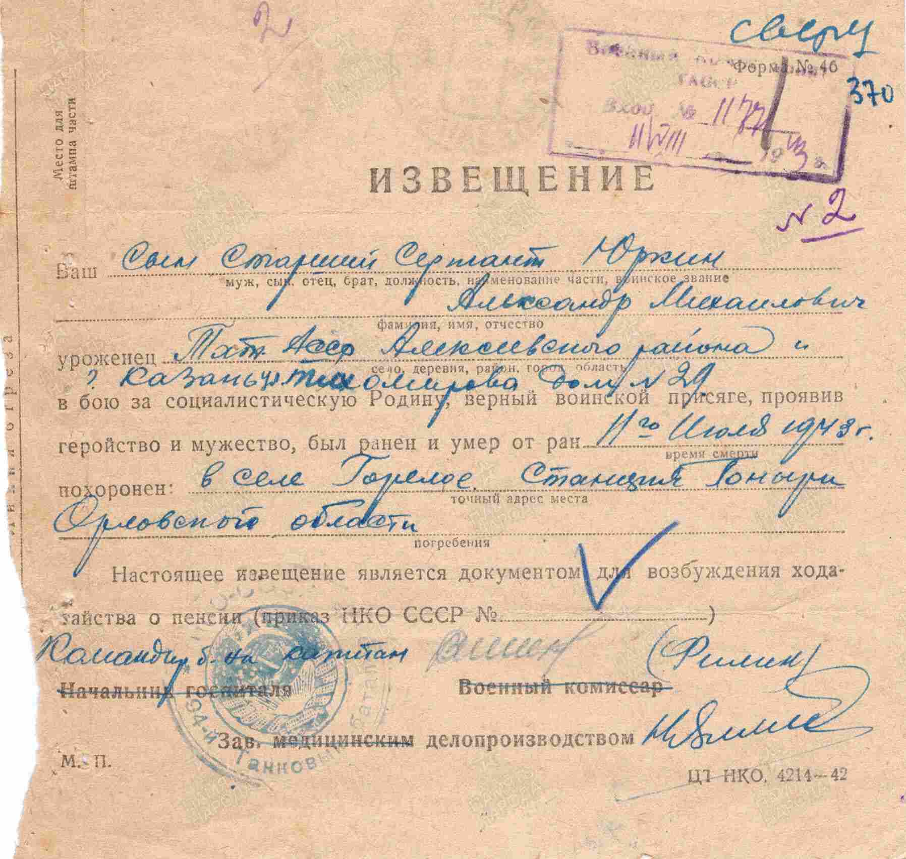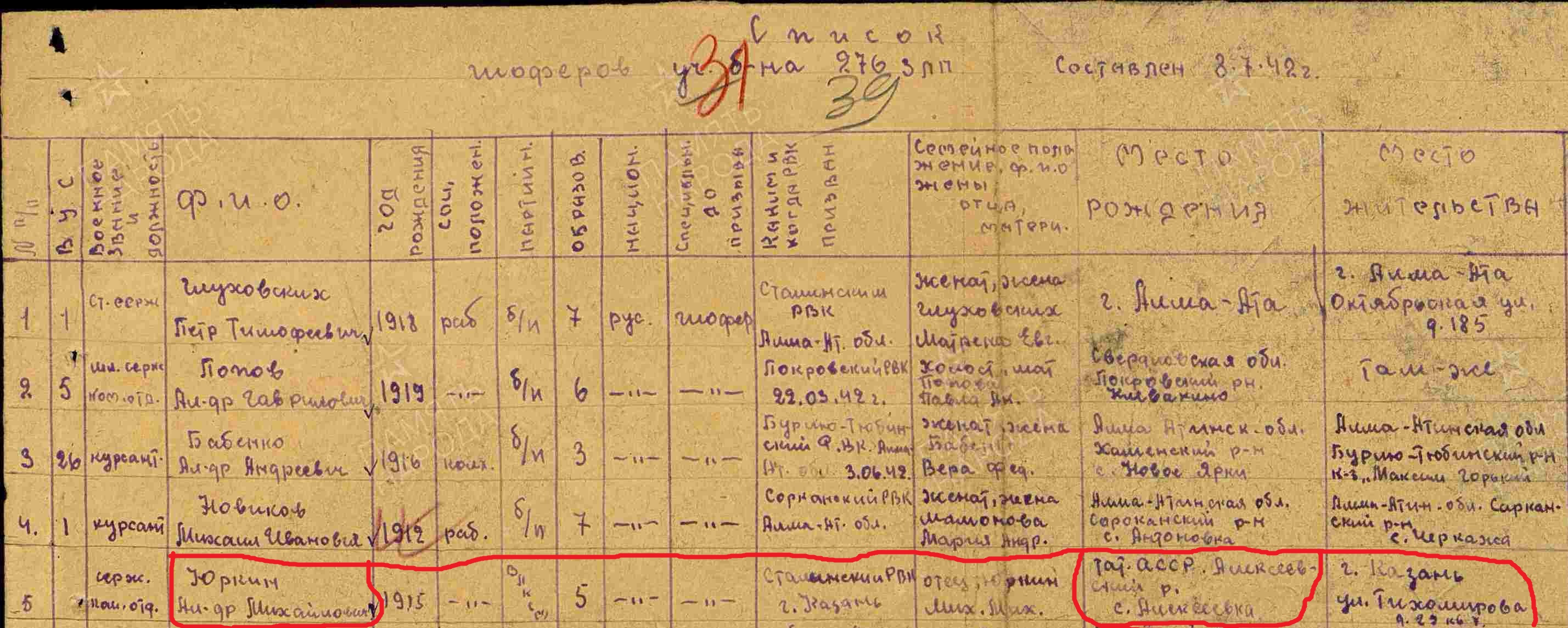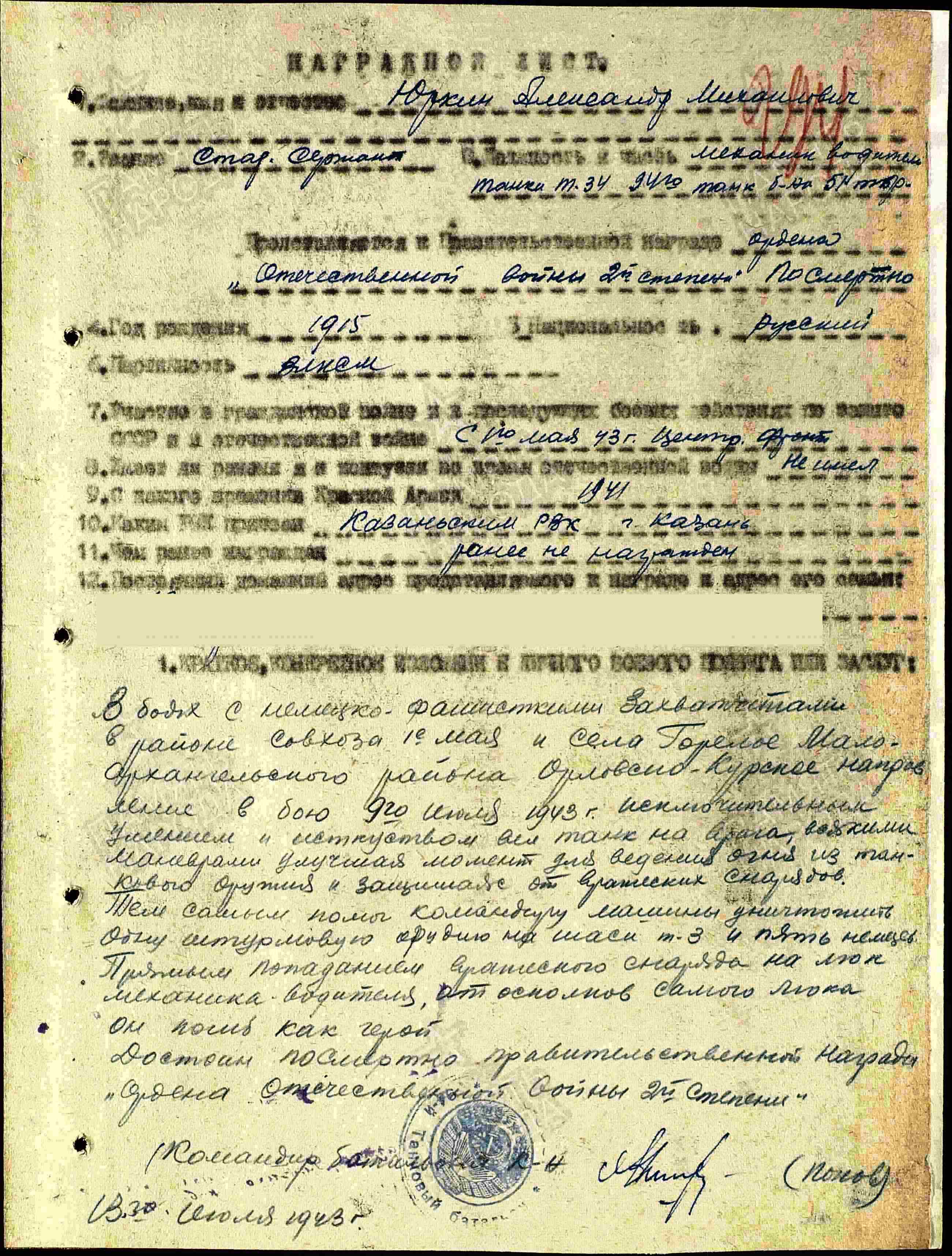 ЮРКИН Александр Михайлович, 1915, с. Алексеевское. Жил в г. Казань. Член ВЛКСМ. Мобилизован добровольцем Сталинским РВК в сент. 1941. В 1943 – ст. сержант, механик-водитель танка Т-34 51 ТБр 3 ТК 2 ТА Центрального фронта. Участник битвы на Курской дуге. Погиб (умер от множественных осколочных ранений) 11 июля 1943, ст. Поныри/ с. Горелое, Малоархангельский (Поныровский) р-н, Орловская (Курская) обл. Награждён орденом Отечественной войны 2 ст. посмертно.