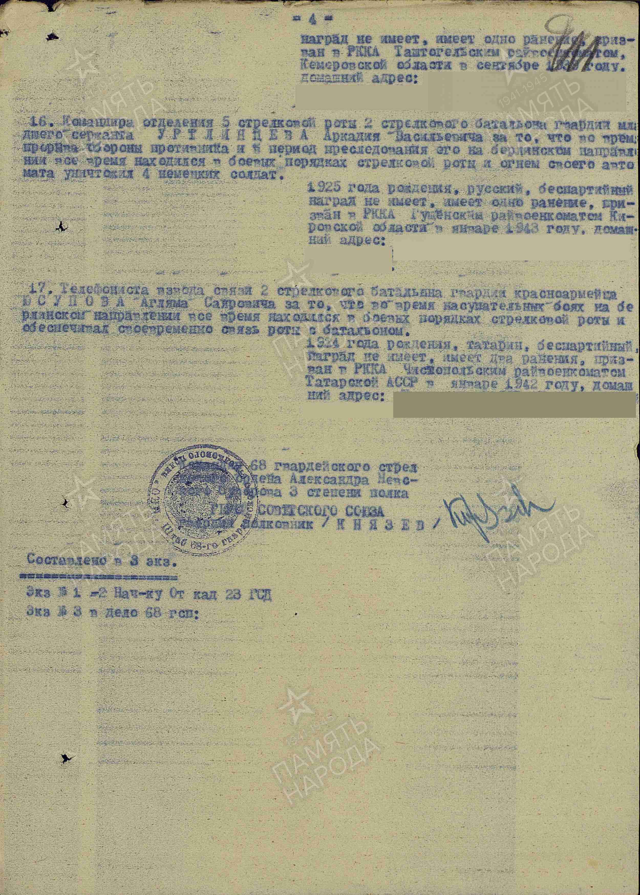 Аглям Саярович Юсупов родился в 1924 г. в д.Кутлушкино, Чистопольского района ТАССР. 22 сентября 1942 года призван в ряды Красной Армии Чистопольским районным военным комиссариатом. Служил в должности телефониста взвода связи 2 стрелкового батальона. Был награжден медалью «За боевые заслуги» (08.08.1945).