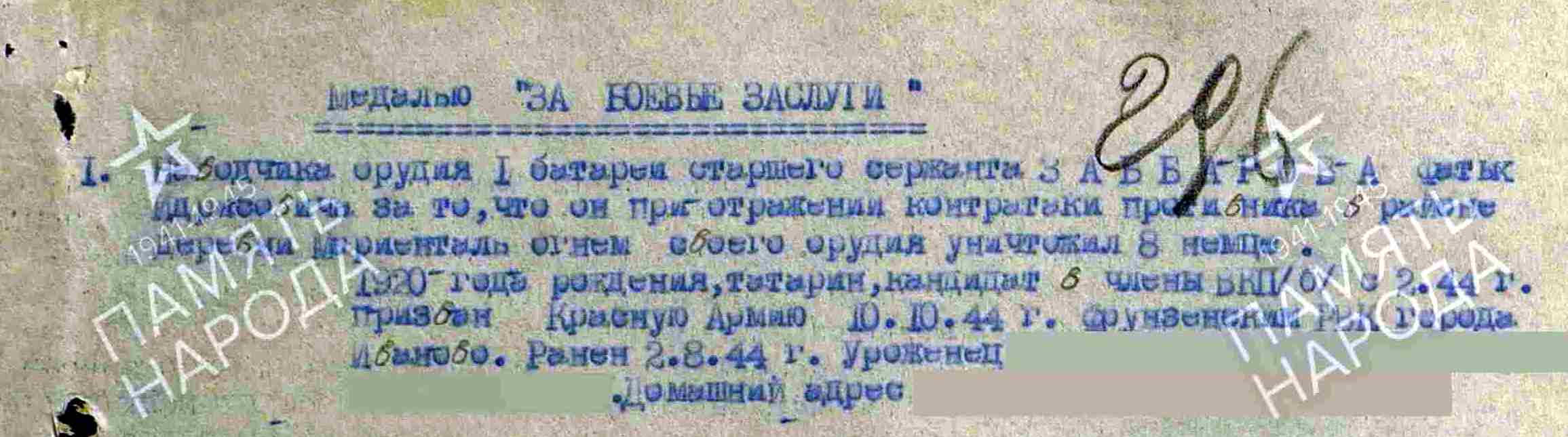 ЗАББАРОВ Фатых Идрисович, 1920, с. Ошняк. Мобилизован Фрунзенским РВК г. Иваново. С апр. 1942 воевал на Западном, Брянском, Белорусском, 1 и 2 Белорусском фронте в составе 50 А/ 19 А/ 49 А/ 3 А. Участник битвы на Курской дуге, освобождения Белоруссии и Польши. Ст. сержант, 828 отд. развед. арт. д-н/ наводчик орудия/ старшина батареи 1967 ИПТАП 44 отд. ИПТАБр РГК. Ранен 8 авг. 1944. Проходил лечение в ХППГ 2232. Демобилизован в 1946. Жил в г. Казань. Награждён медалью «За боевые заслуги», орденом Отечественной войны 1 ст. (1985).