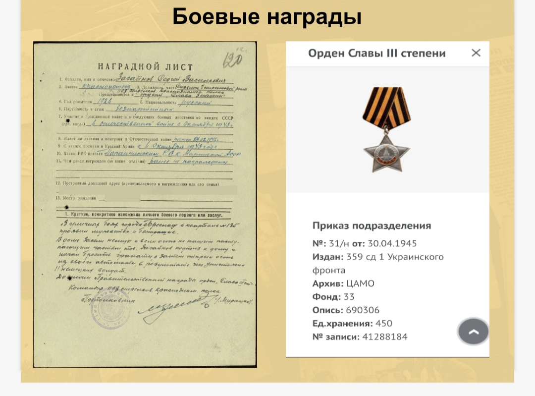 Загайнов Сергей Васильевич был призван 06.10.1943 года, красноармейцем, стрелком в 7 роту 1198 стрелкового Краснознаменного полка. С войны он так и не вернулся, пропал без вести 23.03.1945 года. Известно только, из рассказа бабушки, что от него пришло письмо, в котором он писал о завершении войны и скорой победе над фашистской армией. По документам и из других источников я выяснил, что он участвовал в наступлении на город-крепость Бреслау в феврале 1945 года под Польшей. Был ранен в уличном бою 27.02.1945 года. Он подполз к дому где засели немцы и начал бросать гранаты, а затем открыл огонь, уничтожив 11 немцев тем, самым открыл проход нашим частям. За этот подвиг удостоин наградой - Орденом Славы III степени.