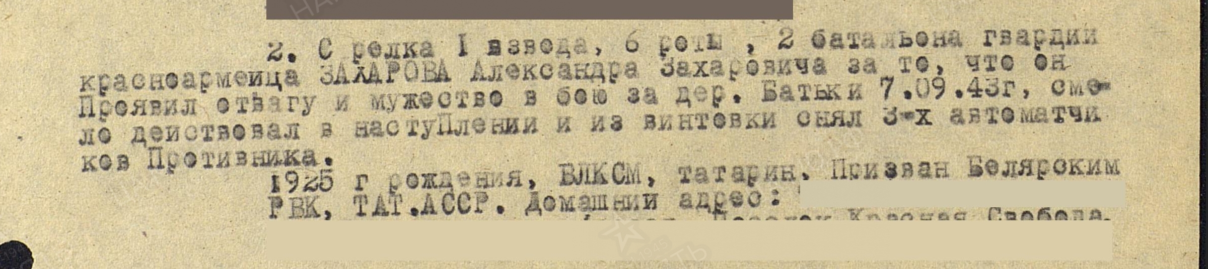 ЗАХАРОВ Александр Захарович, 1925, с. Кр. Баран. Мобилизован Билярским РВК в 1943. Член ВЛКСМ. Гв. красноармеец, стрелок 21 и 18 гв. воздушно-десантного полка 7 гв. ВДД 20 гв. СК 4 гв. А в составе Воронежского и 2 Укр. фронтов. Награждён медалью «За боевые заслуги». Умер от ран 27 окт. 1943 в медико-санитарном батальоне № 40, Полтавская обл., д. Ст. Липовка, правый берег р. Днепр.