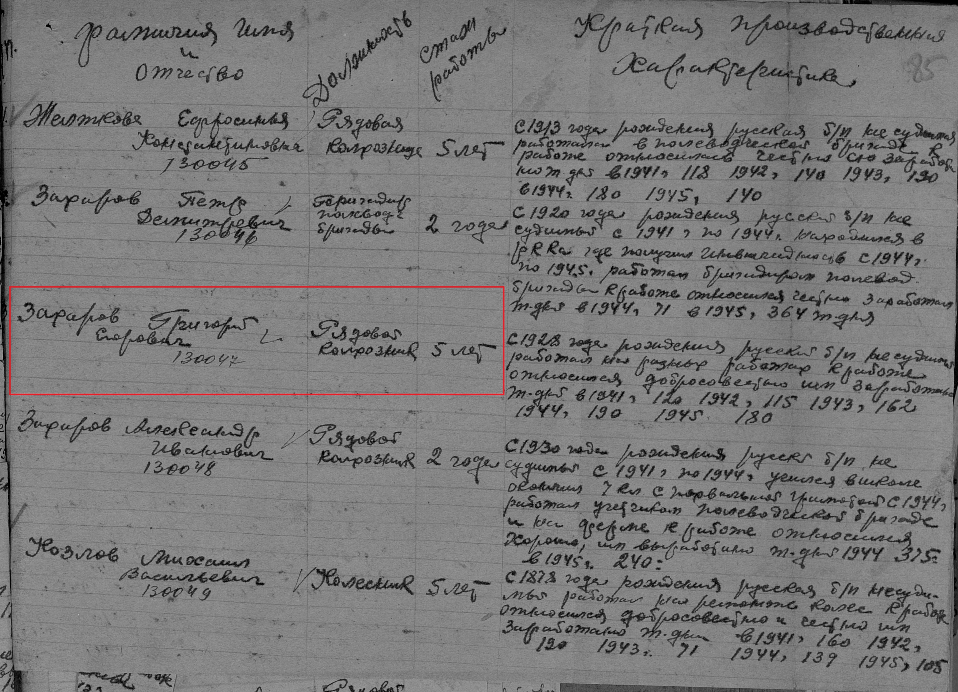 Захаров Григорий Егорович родился в 1928 году в с.Сл.Черемуховая Чистопольского кантона ТАССР. В годы Великой Отечественной войны работал в колхозе к-з "8-е Марта", рядовым колхозником. Награжден медалью "За доблестный труд в Великой Отечественной войне 1941–1945 гг." (акт от 28 апреля 1947г., фонд 3610, опись 2, дело № 325, лист 85, Ак № 130047).