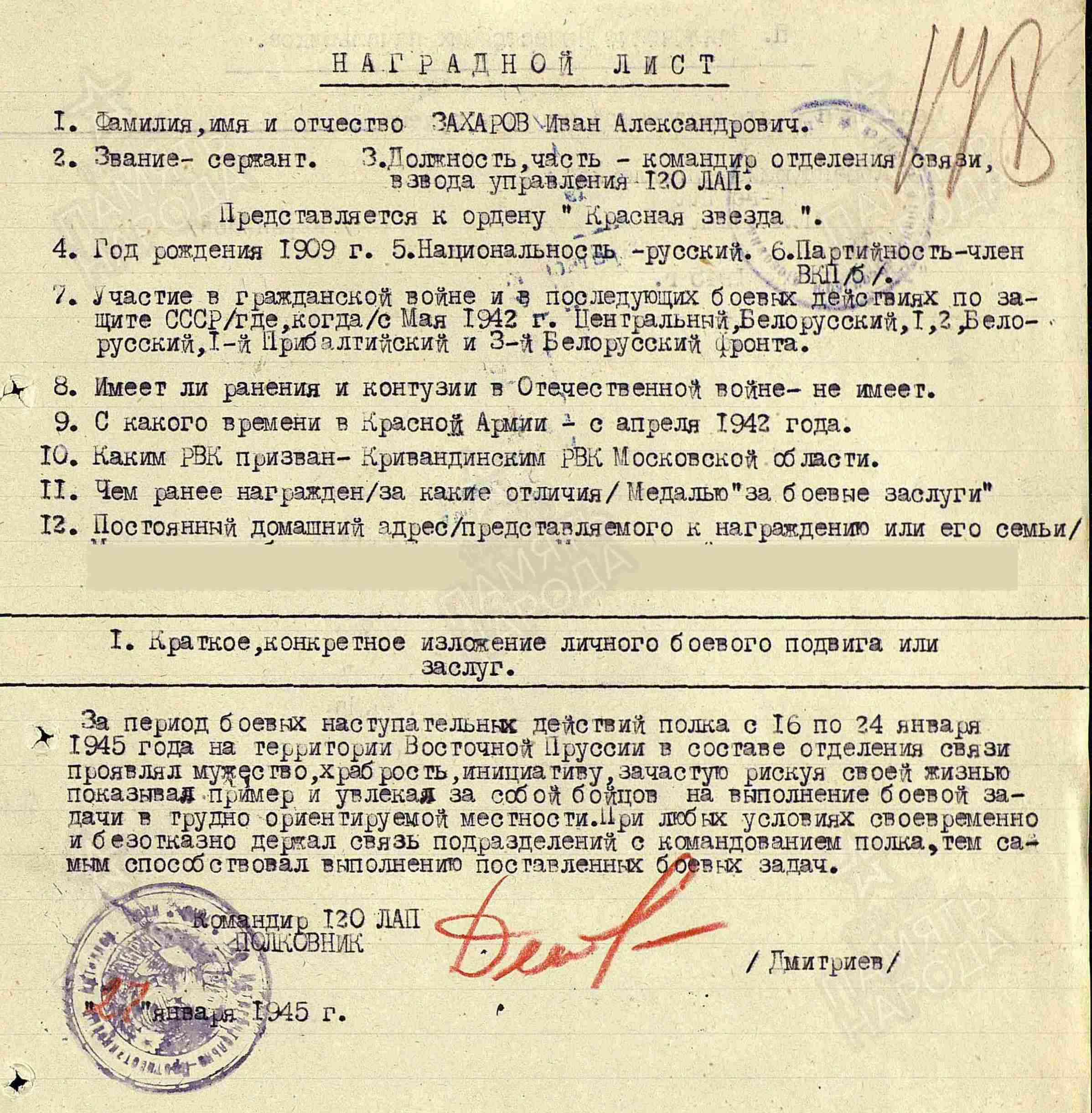 ЗАХАРОВ Иван Александрович, 1909, с. Мокрые Курнали. Мобилизован Кривандинским РВК Московской обл. 22 мая 1942. С апр. 1943 воевал на Центральном, Белорусском, 1 и 2 Белорусском, 1 Прибалтийском, 3 Белорусском фронте в составе 65 А/ 2 гв. А/ 50 А/ 3 А/ 49 А. Член ВКП(б). Участник битвы на Курской дуге, освобождения Белоруссии, Прибалтики, боёв в Вост. Пруссии. Сержант, ком. отделения связи взвода управления 120 ИПТАП РГК/ ЛАП 1 ТК. Демобилизован 28 нояб. 1945. Награждён медалями «За боевые Заслуги», «За взятие Кенигсберга», орденом Красной Звезды.