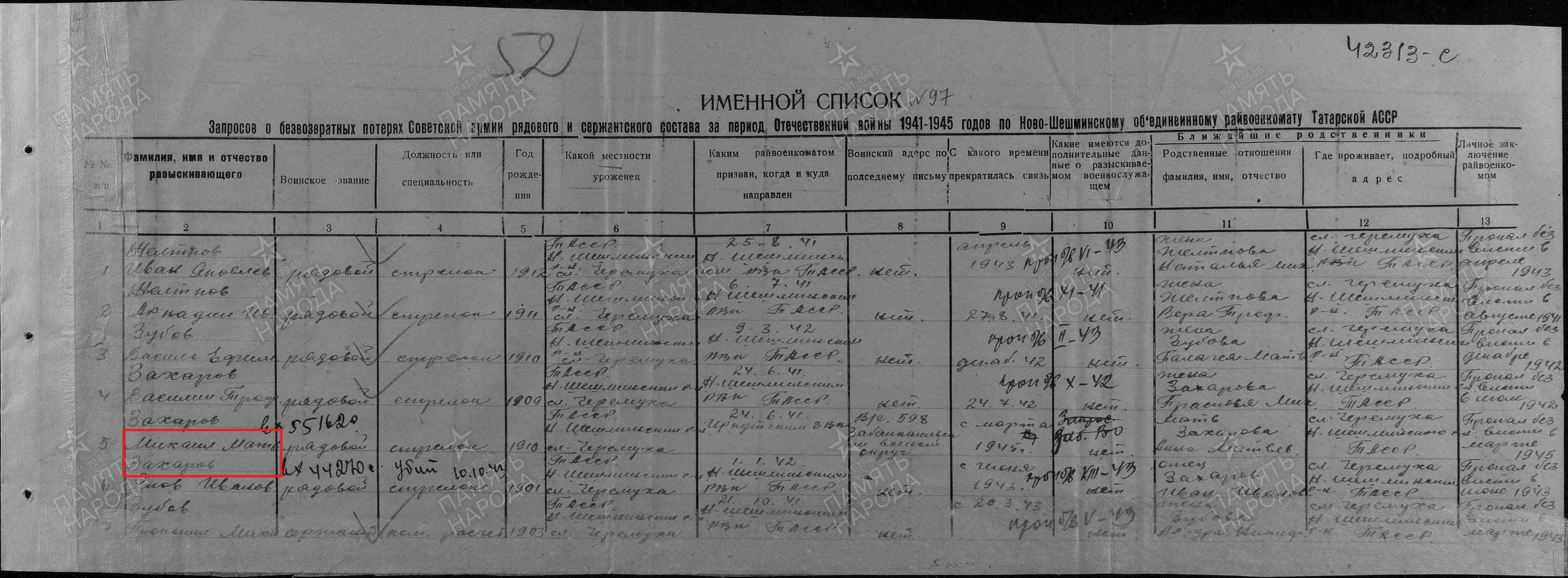 ЗАХАРОВ МИХАИЛ МАТВЕЕВИЧ родился в 1910 году в с.Сл.Черемуховая Казанской губернии Чистопольского уезда Новошешминской волости (ныне с.Слобода Черемуховая Новошешминского района РТ). Мобилизован Иркутским ГВК,кр-ц,68 мехбр,8 мехк. Пропал без вести 25.03.45.г. Область выбытия: Польша, д.Корчмино.