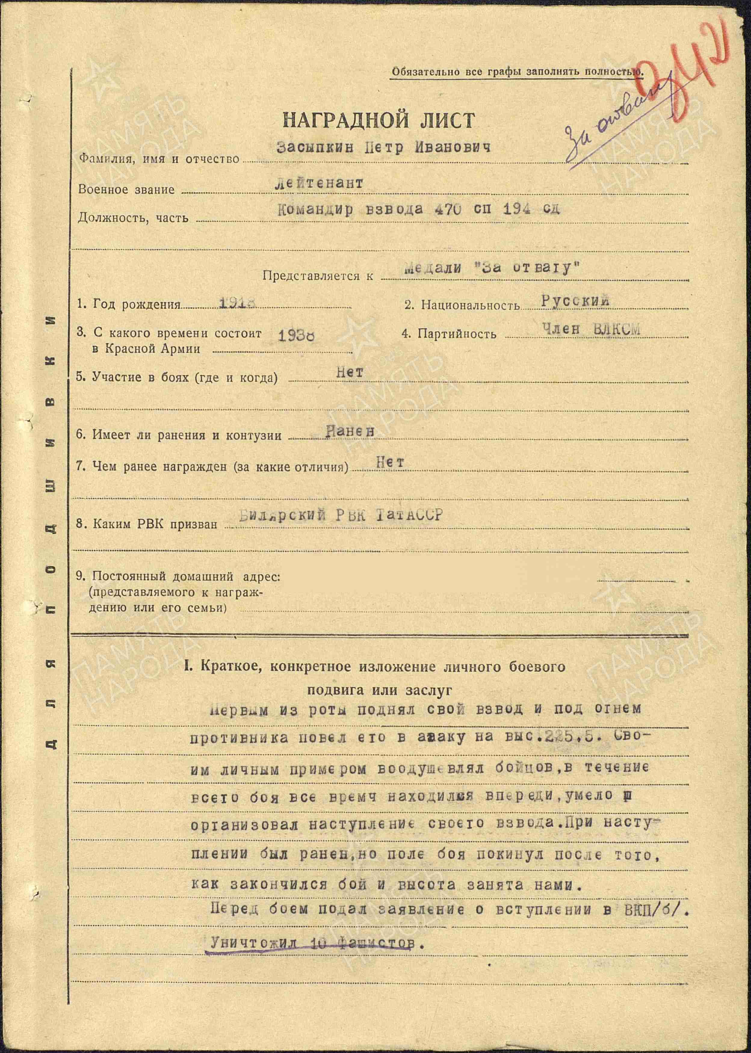ЗАСЫПКИН Пётр Иванович, 1918, с. Билярск. Член ВЛКСМ. Призван в РККА Билярским РВК в 1938. С 5 дек. 1941 воевал на Западном фронте в составе 49 А. Участник контрнаступления под Москвой. Лейтенант, ком. взвода 470 СП 194 СД. Проявил героизм в бою за выс. 225,5. Получил ранение, но не покинул поле боя. Проходил лечение в ЭГ 1748, г. Рязань. Награждён медалью «За отвагу». Дальнейшая судьба не установлена.