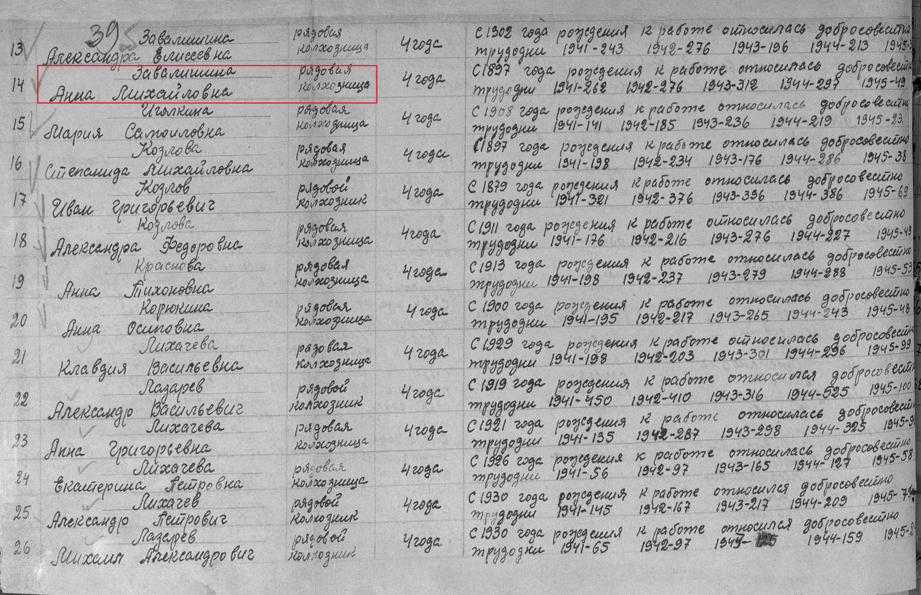 Завалишина Анна Михайловна родилась в 1897 году. Место жительства: с.Новошешминск Ново-Шешминский район ТАССР. В годы Великой Отечественной войны работала в колхозе им. Чкалова рядовой колхозницей. Награждена медалью "За доблестный труд в Великой Отечественной войне 1941–1945 гг." (Акт от 01.1946 г., фонд 3610, опись 2, дело № 174, лист 58).
