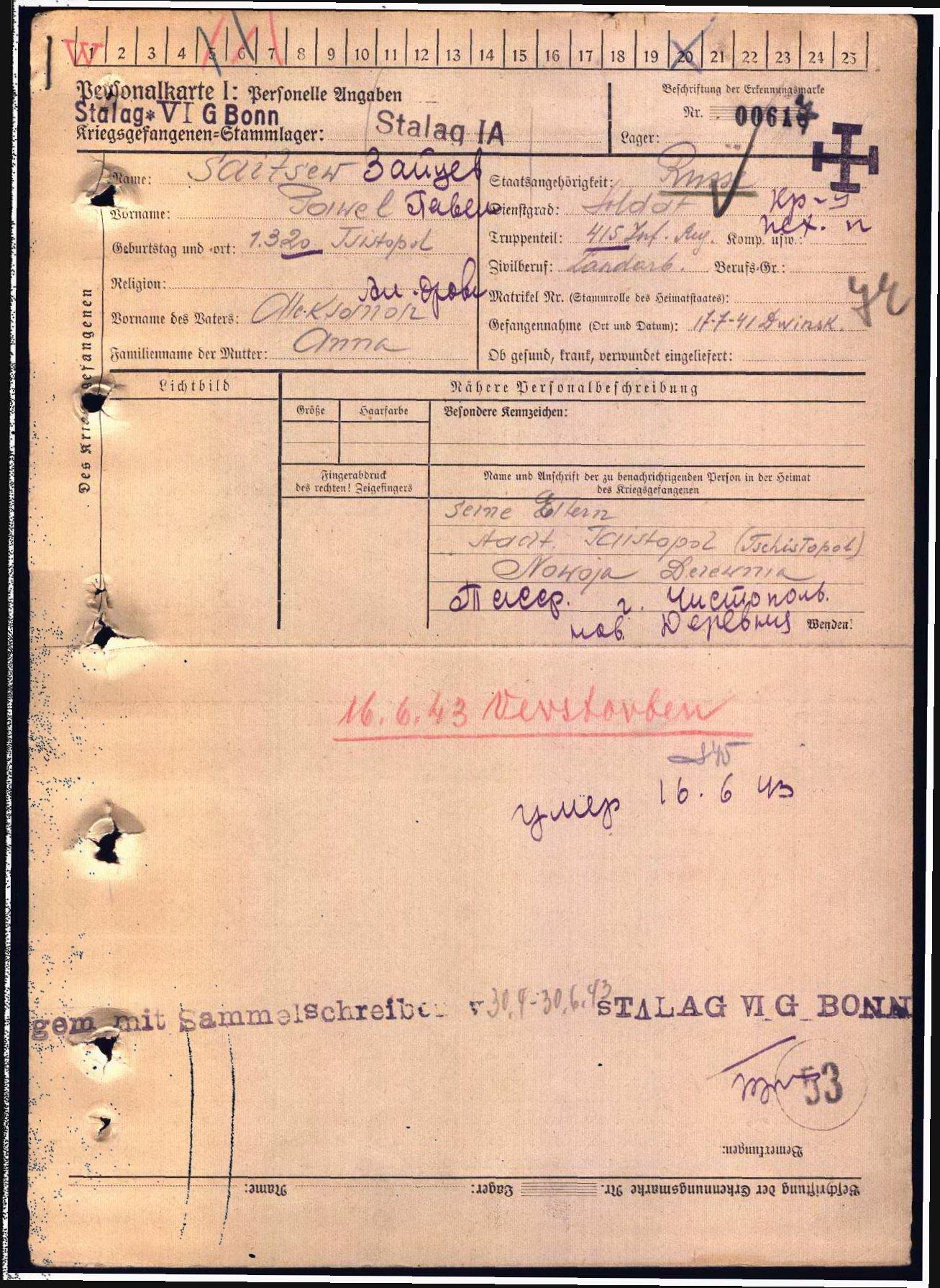Родился 1 марта 1920 г. в с. Чистопольские Выселки Чистопольского кантона ТАССР. Пленён 17 июля 1941 г. под Двинском. Содержался в шталаге I A. Лагерный номер 617. Красноармеец Зайцев Павел Александрович погиб в плену 16 июня 1943 г.