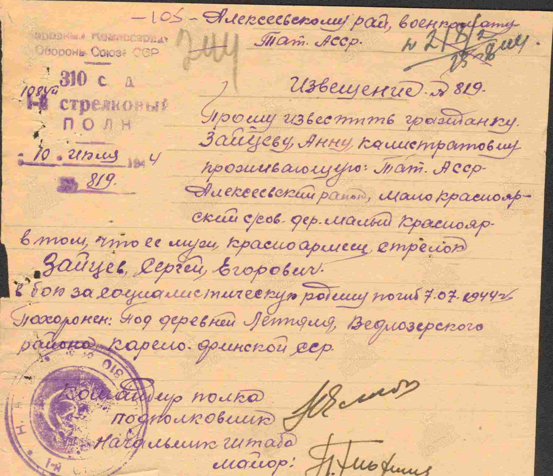 ЗАЙЦЕВ Сергей Егорович, 1898, д. Малый Красный Яр. Мобилизован Алексеевским РВК в 1941 на оборонительные работы, повторно – 1 сент. 1942. В 1944 – красноармеец, стрелок 1084 СП (1 СП) 310 СД 7 А Карельского фронта. Погиб 7 июля 1944, д. Леппяля, Велдозерский (Пряжинский) р-н, Карело-финская ССР (Карелия).