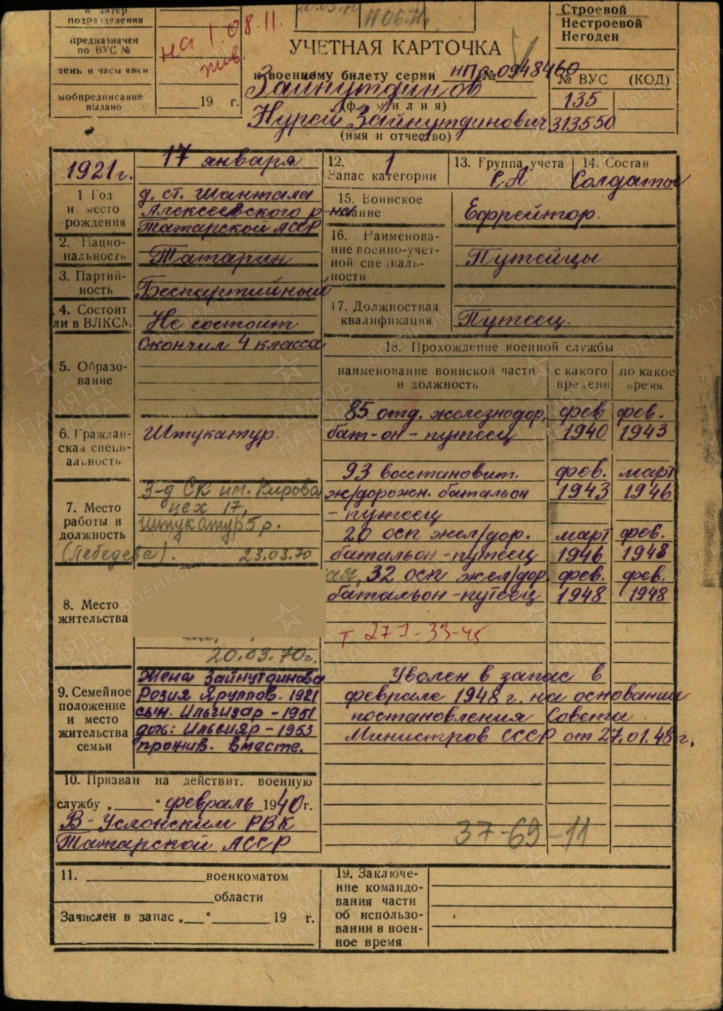 ЗАЙНУТДИНОВ Нурий Зайнутдинович, 1921, с. Степная Шентала. Мобилизован Верхнеуслонским РВК в фев. 1940. В действующей армии с 22 июня 1941. Красноармеец/ ефрейтор, путеец 85 отд. железнодорожного батальона; путеец путевой роты 93 восстановительный ж/д батальон 25 ЖДБр. Участвовал в боевых операциях по восстановлению ж/д путей и обеспечению ж/д сообщений на разных фронтах, в войне с Японией. Демобилизован в фев. 1948. Награждён медалями «За боевые заслуги», «За оборону Москвы», «За взятие Кёнигсберга», «За победу над Японией», орденом Отечественной вйоны 2 ст. (1985). Жил и работал в г. Казань.